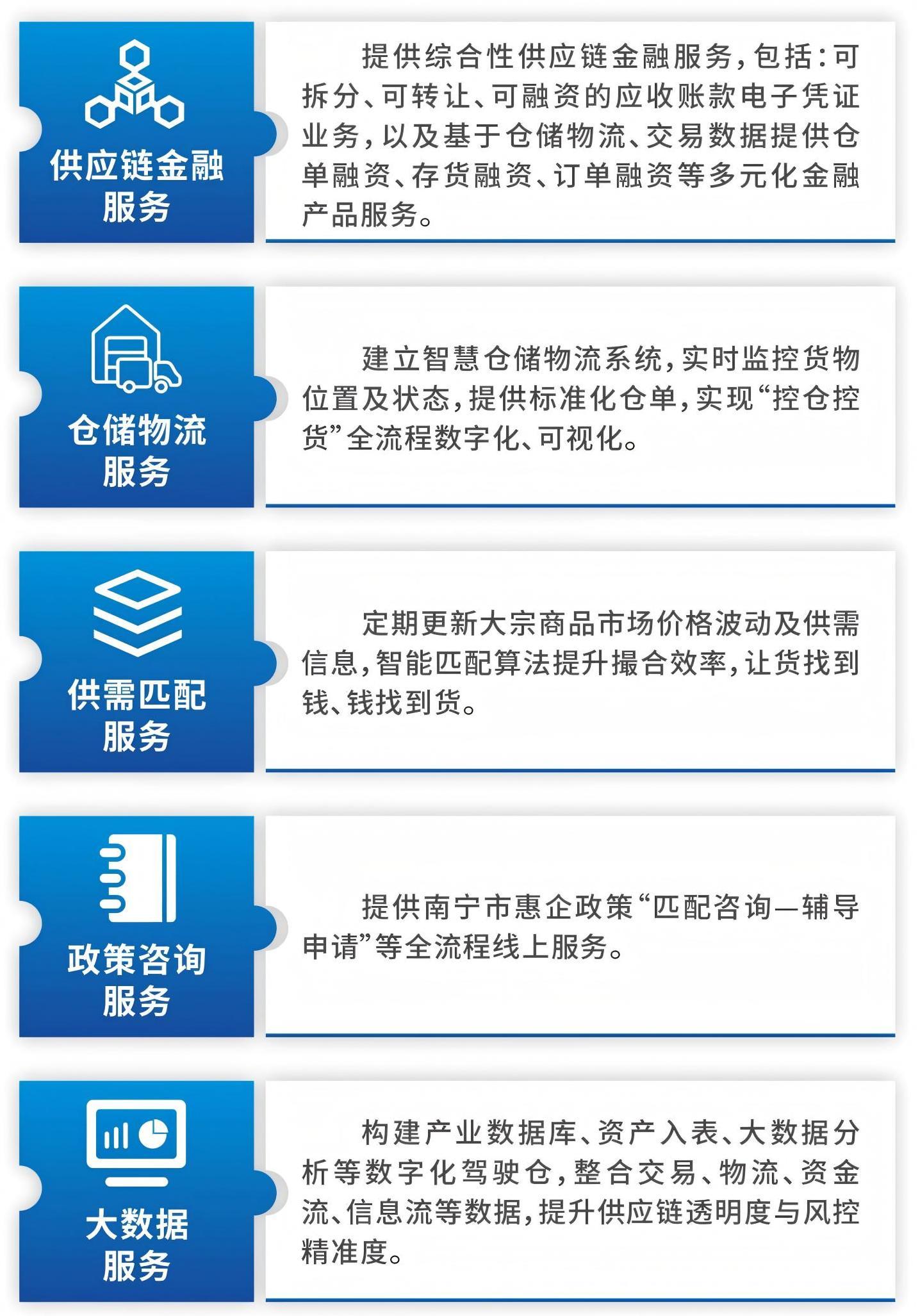 南寧的企業(yè)朋友們注意啦!在南寧市委、市政府全力推動下,由南寧威寧集團所屬南寧供應鏈集團建設運營的南寧市供應鏈綜合服務平臺“邕鏈通”,將于近期上線試運營,并計劃于年底前正式運營!作為金融創(chuàng)新的關(guān)鍵載體,“邕鏈通”依托南寧獨特的區(qū)位優(yōu)勢與資源稟賦,通過整合區(qū)域供應鏈資源,運用人工智能、大數(shù)據(jù)等技術(shù),促進供需精準匹配和資源優(yōu)化配置,構(gòu)建“主體信用+物的信用+數(shù)據(jù)信用”三維融資體系。旨在打破信息壁壘,創(chuàng)新金融服務模式,解決中小企業(yè)融資難題,同時以供應鏈金融賦能產(chǎn)業(yè)招商引資。
