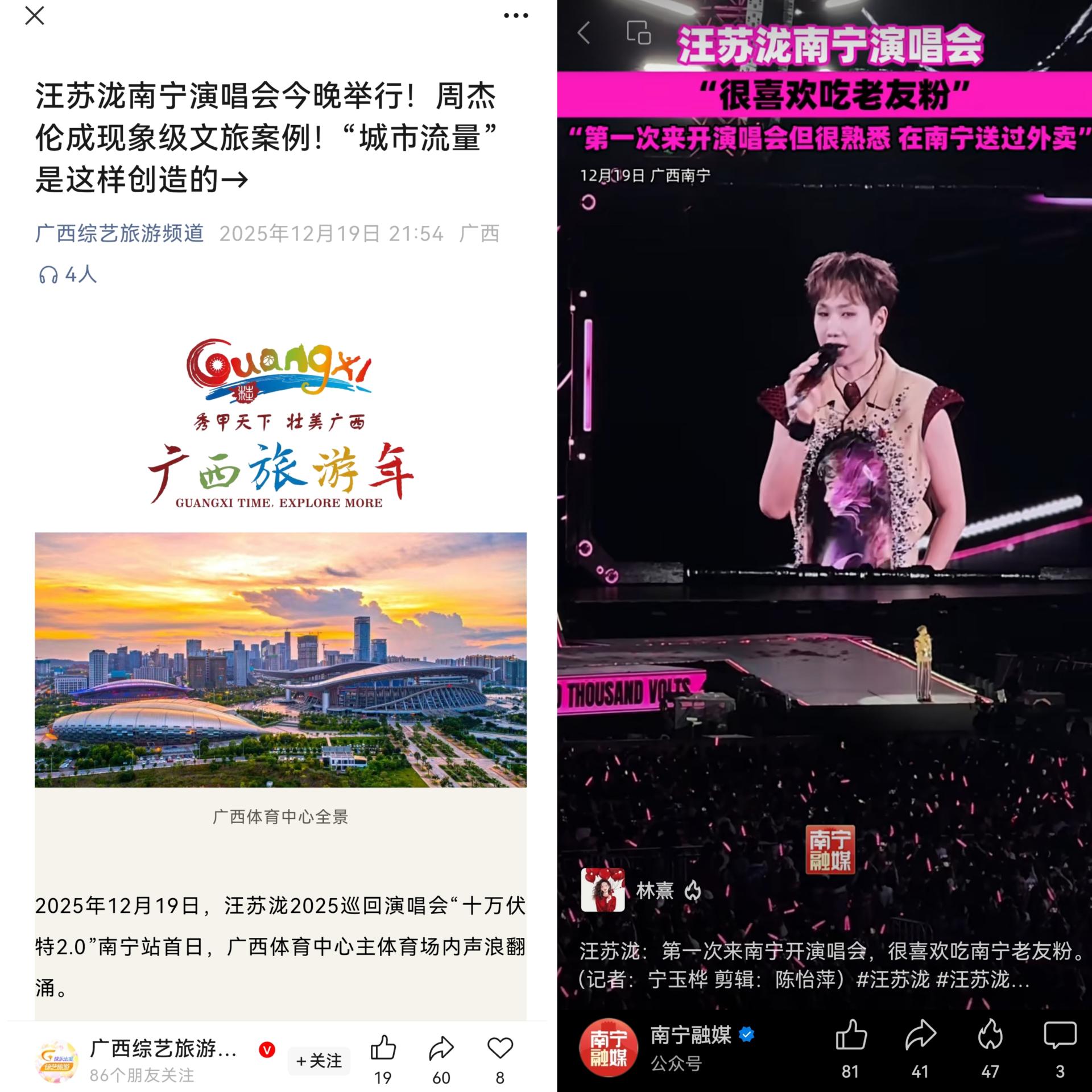 12月19日至20日,汪蘇瀧「十萬(wàn)伏特2.0」巡回演唱會(huì)南寧站在南寧文旅集團(tuán)·廣西體育中心燃情開(kāi)唱。當(dāng)粉色應(yīng)援海洋席卷會(huì)場(chǎng),這座專屬南寧的“羅曼城”為到場(chǎng)的8萬(wàn)多名觀眾點(diǎn)亮了12月的夜晚,驅(qū)散了冬日的微寒。這不僅是一場(chǎng)視聽(tīng)盛宴,也是聯(lián)動(dòng)整座城市文旅脈搏的一次深度共振與奔赴。