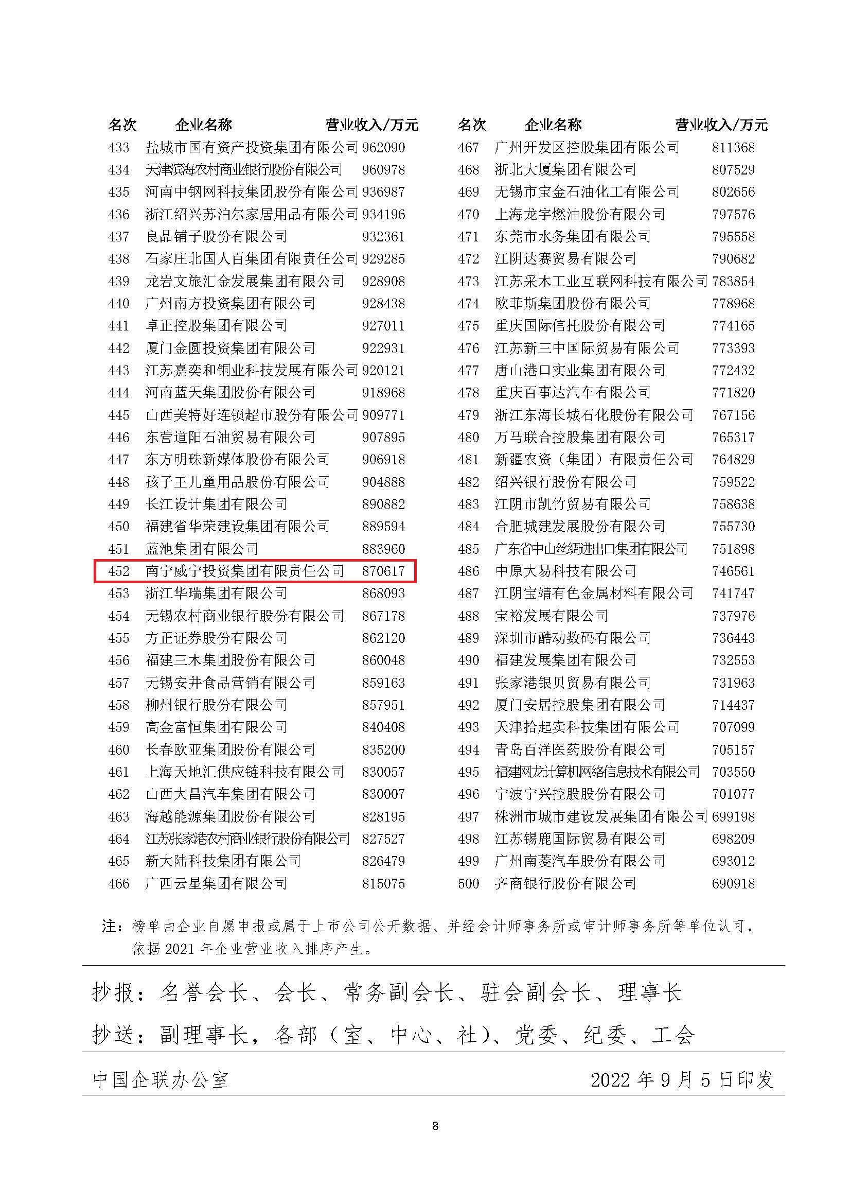 近日,中國企業(yè)聯合會、中國企業(yè)家協會發(fā)布了“2022中國服務業(yè)企業(yè)500強”榜單,南寧威寧集團再度榮登,成為唯一一家連續(xù)七年入圍中國服務業(yè)企業(yè)500強的南寧市屬國有企業(yè)。