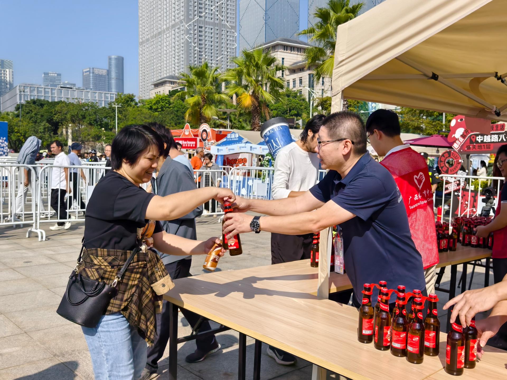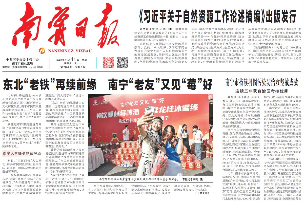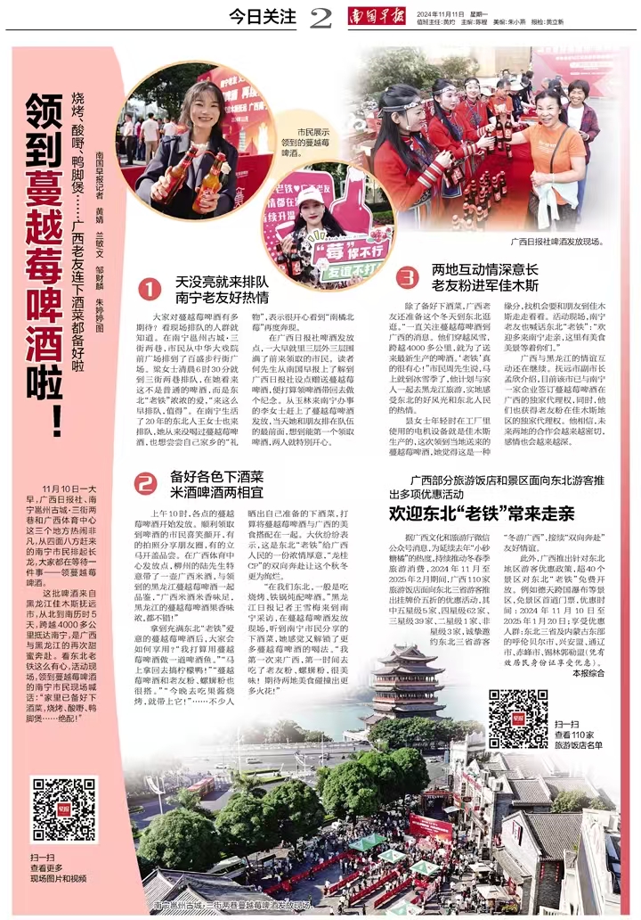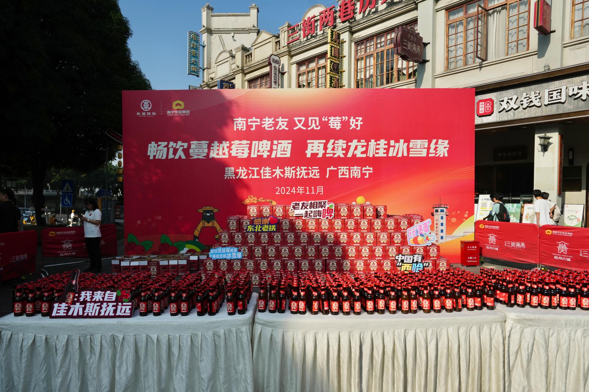 2024年年初,跨越南北3650公里來到南寧的東北蔓越莓在邕州古城·三街兩巷發(fā)放,南寧市民領(lǐng)取蔓越莓的熱鬧場景依舊歷歷在目。如今蔓越莓再豐收,熱情的東北“老鐵”將蔓越莓“變身”釀成啤酒贈予南寧“老友”品嘗。11月10日,南寧威寧集團下屬南寧文化旅游集團有限責任公司(以下簡稱南寧文旅集團)的兩大標志性項目——邕州古城·三街兩巷與廣西體育中心,成為了蔓越莓啤酒的發(fā)放站點,而銀河大酒店、鄉(xiāng)村大世界、五象山莊、邕城印記民俗中心等南寧文旅集團旗下餐飲品牌也將蔓越莓啤酒與各種美食相結(jié)合,為市民們安排了一系列贈飲品嘗活動。