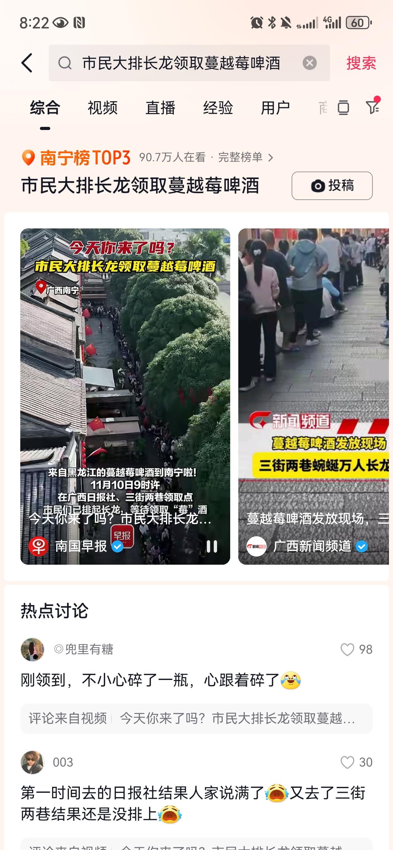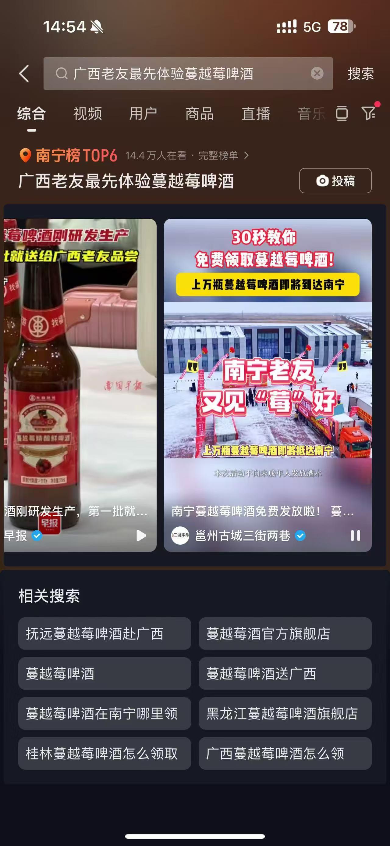 11月10日,由黑龍江日?qǐng)?bào)、廣西日?qǐng)?bào)策劃的#蔓越莓啤酒燃爆南寧#市民大排長(zhǎng)龍領(lǐng)取蔓越莓啤酒 相關(guān)話題分別登上抖音廣西同城熱榜TOP2、TOP3,熱搜頭條均為三街兩巷蔓越莓啤酒發(fā)放現(xiàn)場(chǎng),話題熱度累計(jì)超1500萬。三街兩巷蔓越莓領(lǐng)取攻略視頻、推文、直播曝光量超70萬,多個(gè)#三街兩巷蔓越莓相關(guān)話題受到市民網(wǎng)友熱議。
