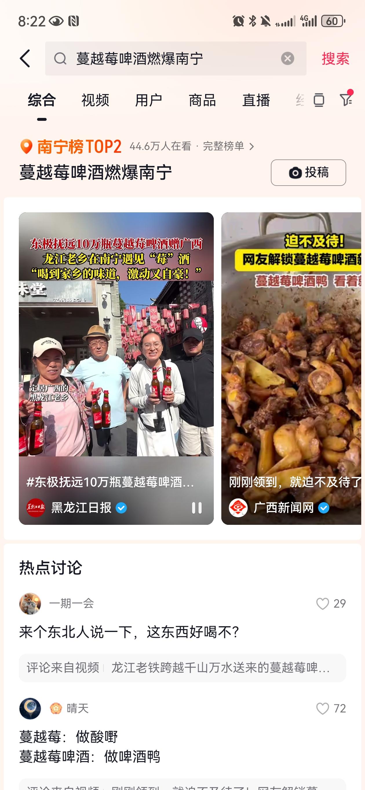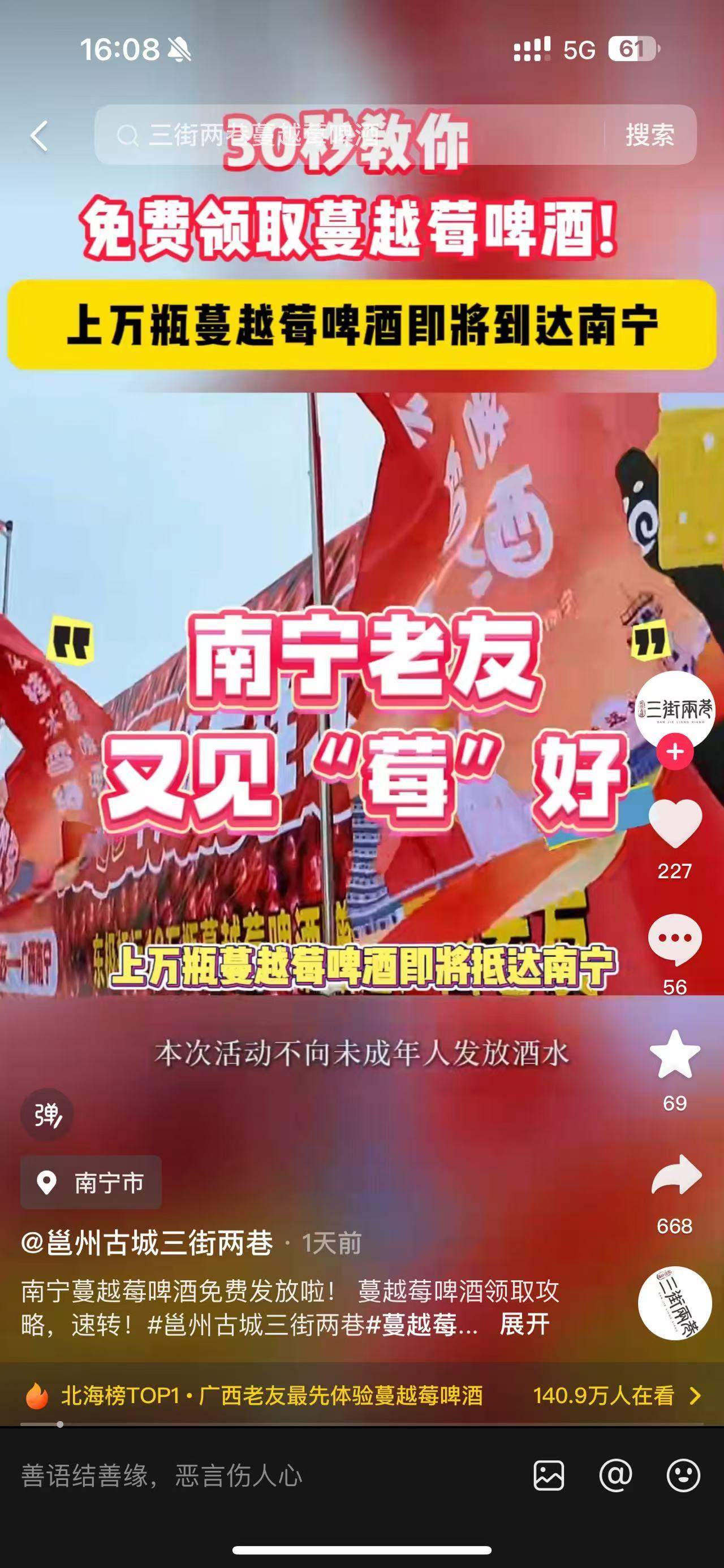 在社交平臺(tái)上,蔓越莓啤酒再度刷屏。11月8日,南寧文旅集團(tuán)率先通過策劃抖音話題#廣西老友最先體驗(yàn)蔓越莓啤酒,并提報(bào)相關(guān)蔓越莓啤酒領(lǐng)取攻略等內(nèi)容,以395萬話題討論量登上廣西南寧熱榜TOP5,柳州、北海等外地?zé)岚馮OP1。由南寧文旅集團(tuán)制作的蔓越莓啤酒攻略的推文和視頻得到各大媒體、達(dá)人的轉(zhuǎn)載和引用。