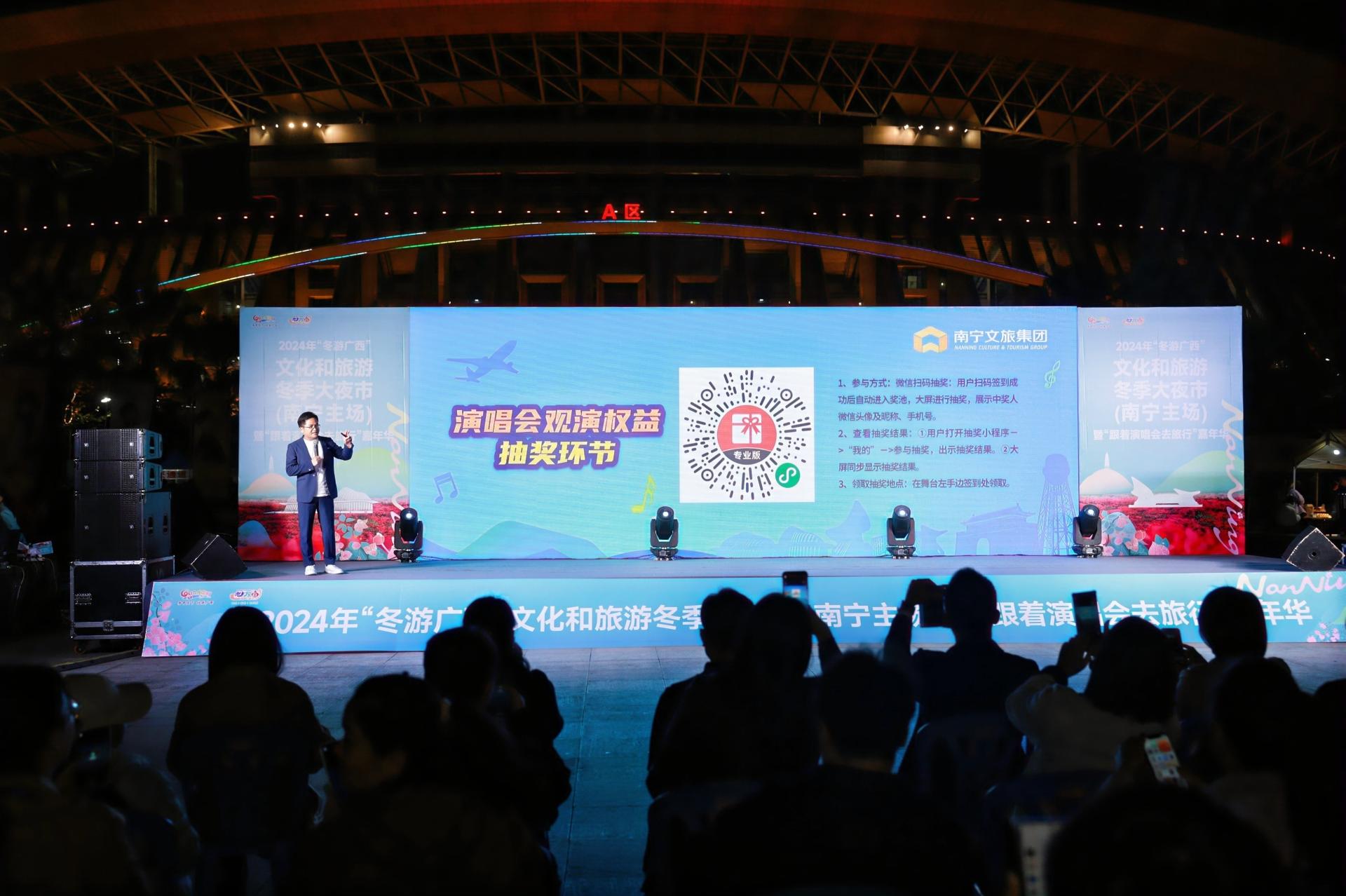 隨著演唱會(huì)經(jīng)濟(jì)市場(chǎng)持續(xù)繁榮,“為一場(chǎng)演出而奔赴一座城”已成為撬動(dòng)城市文旅消費(fèi)的“金鑰匙”。為提振歲末年初文旅消費(fèi)市場(chǎng),全方位展示廣西和南寧特色的民族文化品牌形象,以周深演唱會(huì)為契機(jī),由廣西壯族自治區(qū)文化和旅游廳、南寧市人民政府主辦,南寧市文化廣電體育和旅游局、商務(wù)局以及良慶區(qū)人民政府承辦,良慶區(qū)文化廣電體育和旅游局、南寧威寧文化體育發(fā)展有限公司協(xié)辦的2024年“冬游廣西”文化和旅游冬季大夜市(南寧主場(chǎng))暨“跟著演唱會(huì)去旅行”嘉年華活動(dòng)在廣西體育中心舉行。