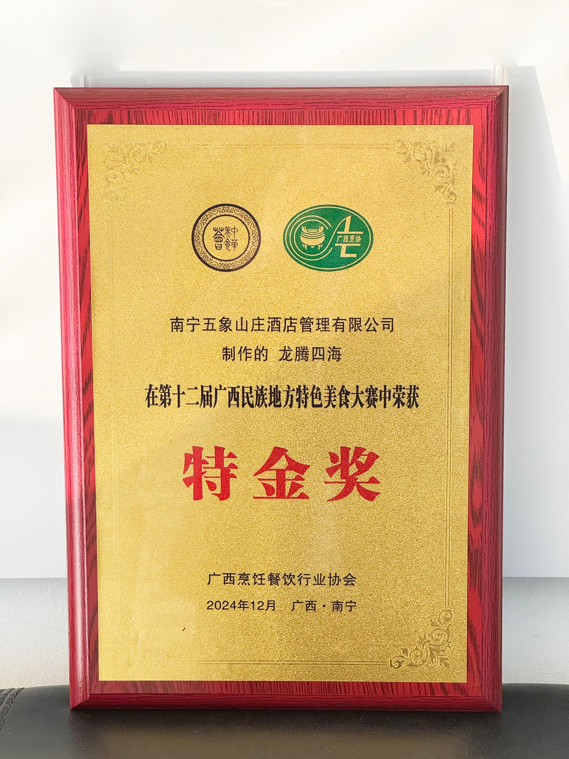近期,五象山莊廚師團(tuán)隊(duì)在第十二屆廣西民族地方特色美食大賽、全國(guó)沿海城市海鮮烹飪技能爭(zhēng)霸賽中脫穎而出,一舉奪得2024年全國(guó)沿海城市海鮮烹飪技能爭(zhēng)霸賽一等獎(jiǎng);第十二屆廣西民族地方特色美食大賽一項(xiàng)菜品“特金獎(jiǎng)”、一項(xiàng)菜品“金獎(jiǎng)”,在高手如林的美食行業(yè)中盡顯一枝獨(dú)秀。