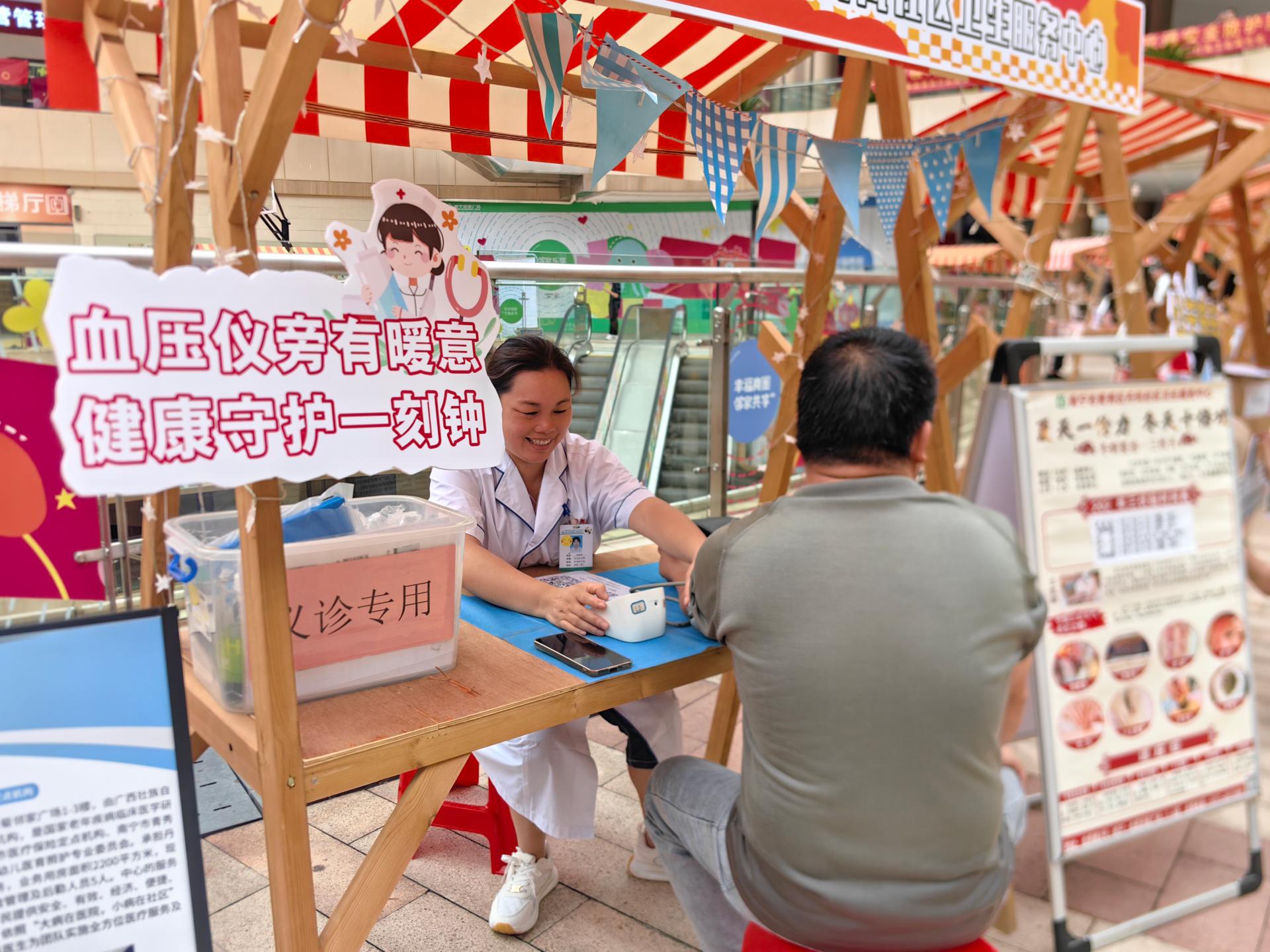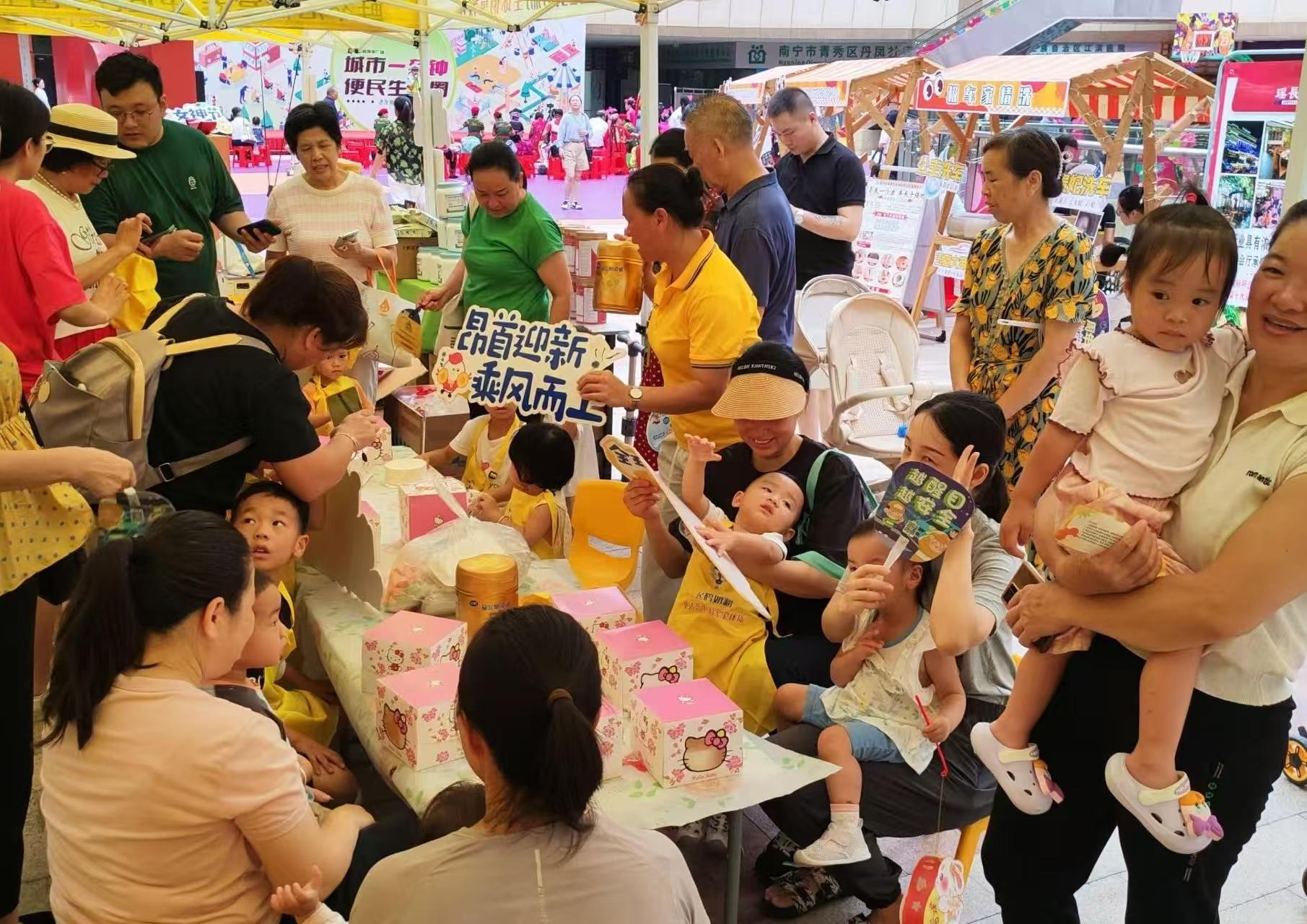 舞臺上熱鬧不停,臺下市集更是人氣爆棚。瑤長府的油茶攤前,不到1小時就送出近100碗熱乎油茶,濃郁香氣里飄著鄰里間的寒暄;安恩寶月子中心的免費三伏貼攤位前,寶媽們排起長隊,老人們也來咨詢養(yǎng)生知識,“一老一小”的關(guān)懷在這里悄悄流動;桂墾食堂的套圈游戲前,大人孩子齊上陣,套中廣西香米的居民舉著獎品笑稱“這是一刻鐘生活圈的第一份收獲”。