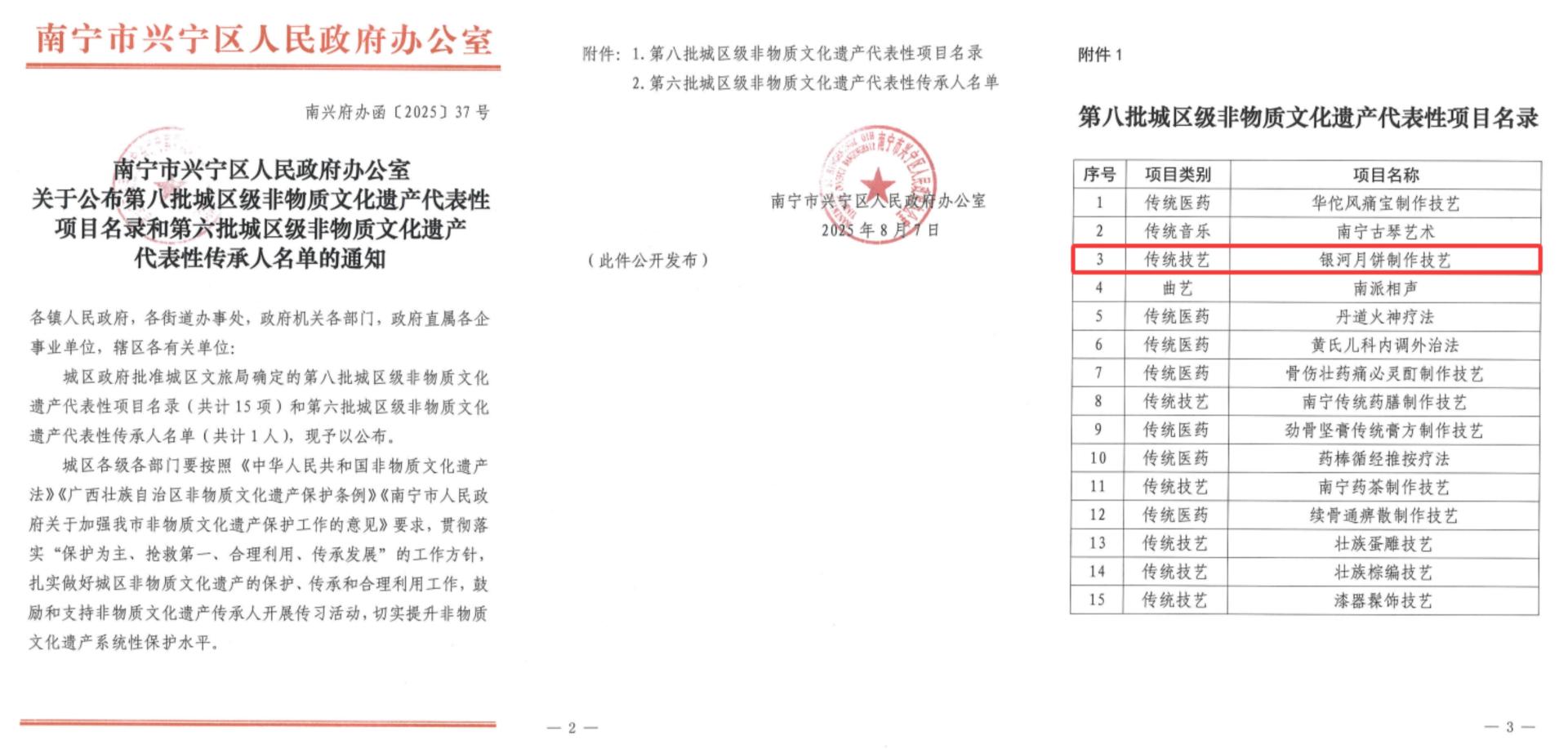 匠心傳承,文脈賡續(xù);文化根脈,再譜新篇。近日,南寧文旅集團(tuán)旗下銀河公司 “銀河月餅制作技藝” 正式入選南寧市興寧區(qū)第八批非物質(zhì)文化遺產(chǎn)代表性項(xiàng)目名錄。此前,銀河公司已獲自治區(qū)級(jí)非物質(zhì)文化遺產(chǎn)代表性項(xiàng)目 “南寧老友粉” 傳承基地稱(chēng)號(hào),其 “邕城涼茶制作技藝” 亦入選南寧市級(jí)非物質(zhì)文化遺產(chǎn)代表性項(xiàng)目。此次入選,是銀河公司在本土傳統(tǒng)技藝挖掘、保護(hù)與活化利用領(lǐng)域的又一重要成果,標(biāo)志著企業(yè)品牌文化底蘊(yùn)與核心競(jìng)爭(zhēng)力的持續(xù)提升。
