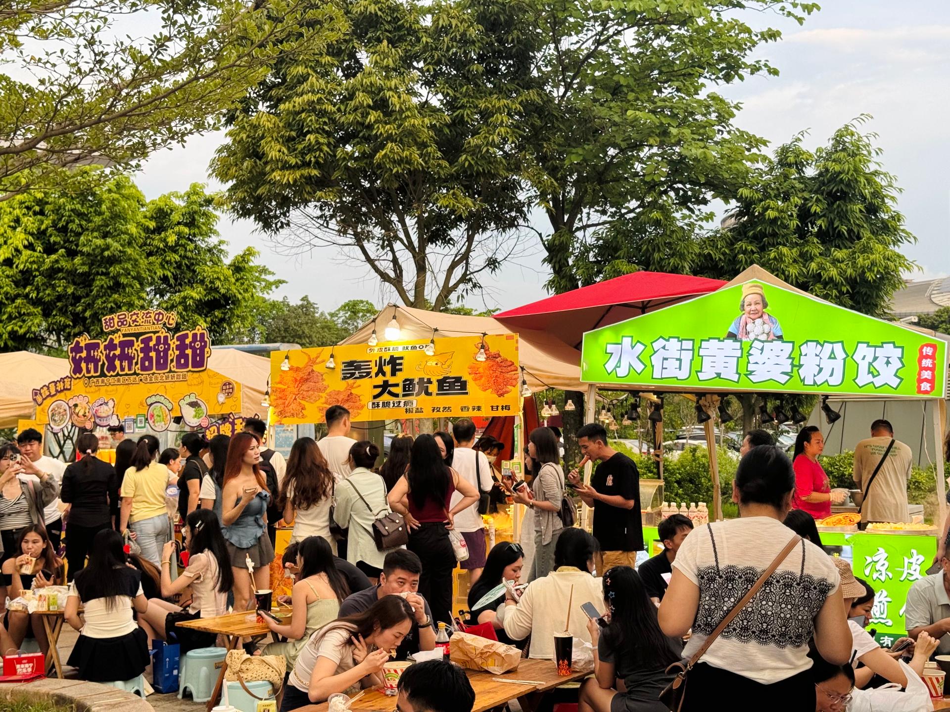 南寧文旅集團(tuán)配套市集“樂市市集”是本次活動的一大亮點(diǎn),場內(nèi)場外共設(shè)置55個市集攤位,外場主題市集單日吸引客流近2萬人次。市集上,特色美食香氣四溢,文創(chuàng)產(chǎn)品琳瑯滿目,讓歌迷在觀演之余,還能盡情享受購物與美食的樂趣,深度體驗(yàn)?zāi)蠈幍某鞘绪攘εc文化風(fēng)情,為歌迷打造了一站式吃喝游娛樂購的消費(fèi)場景,極大地豐富了歌迷的觀演體驗(yàn)。