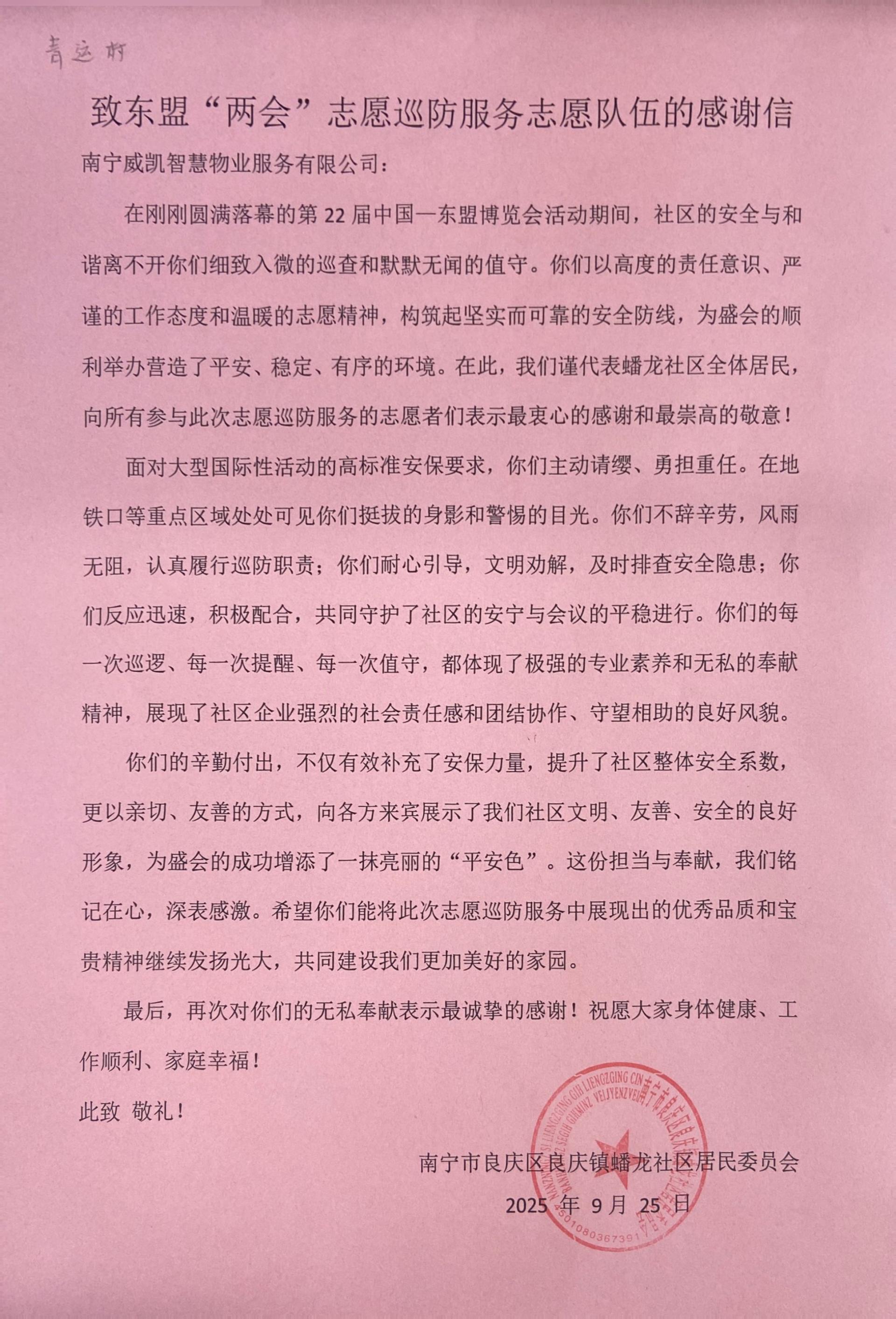 黃耀逢“愿意為您搭把手”的真誠,正是威凱智慧物業(yè)所有一線員工將心比心、樂于“搭把手”服務(wù)精神的真實寫照。這份服務(wù)熱枕,不僅收獲了業(yè)主的信任,更贏得了來自外界的認(rèn)可——在剛剛落幕的第22屆中國—東盟博覽會期間,威寧青運村物業(yè)服務(wù)團(tuán)隊因積極主動參與志愿巡防服務(wù),為守護(hù)社區(qū)安寧與會議平穩(wěn)運行做出貢獻(xiàn),得到了南寧市良慶區(qū)蟠龍社區(qū)居民委員會送來的感謝信。