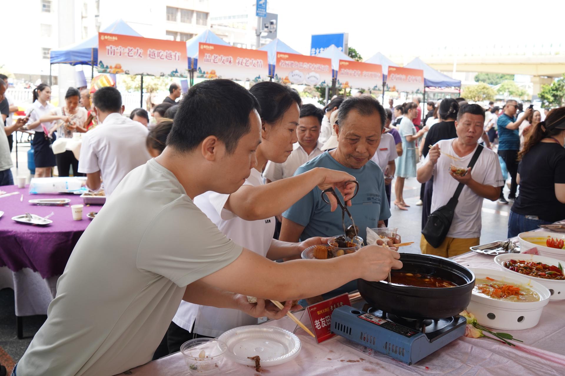 活動現(xiàn)場,銀河大酒店廚師團(tuán)隊現(xiàn)場制作了自治區(qū)級非物質(zhì)文化遺產(chǎn)代表性項目“老友粉”,及35道“老友味道”美食邀請“老友”品鑒;剛在吉林省吉林市“世界鍋包肉大賽”中榮獲“鍋包肉名廚”的師傅還在現(xiàn)場制作東北特色鍋包“又”,讓現(xiàn)場的老友感受南北地方美食文化和不同的煙火氣息。