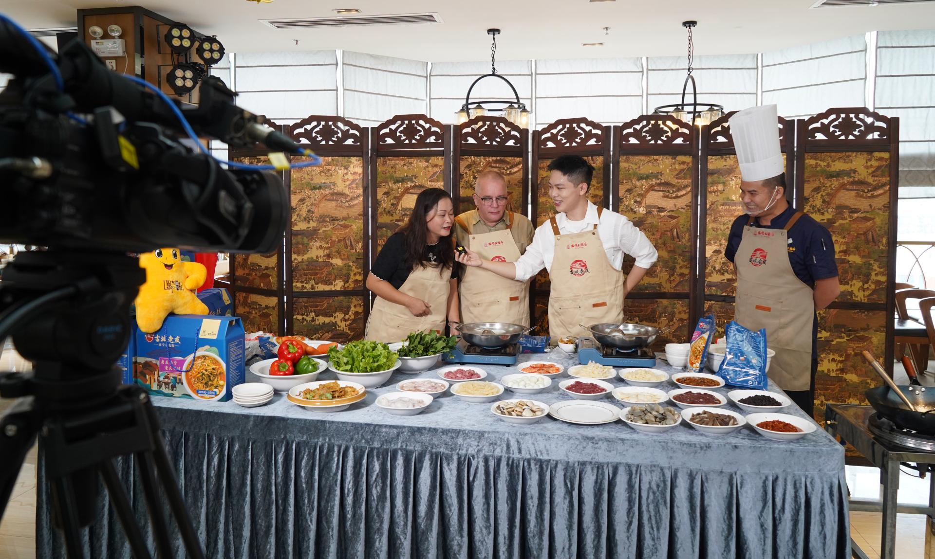 在大廚烹飪區(qū),酒店大廚展示袋裝老友粉煮制技巧,主持人楊濤邀請現(xiàn)場來自南寧和芬蘭的食客向酒店大廚學(xué)習(xí)煮制預(yù)包裝“古城老友粉”。濃郁的老友味道完全媲美門店現(xiàn)煮口感,甚至是“玩出了花”,讓外國友人也加入了嗦粉大軍。一場有“味道”的直播,向全國觀眾種草“南寧老友粉”。
