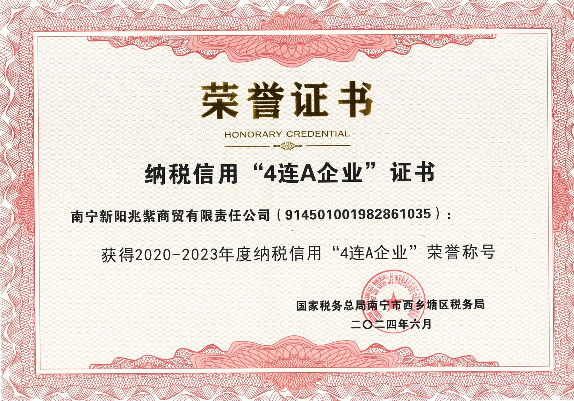近日,威寧資產(chǎn)經(jīng)營集團(tuán)監(jiān)管單位新陽兆紫商貿(mào)公司榮獲國家稅務(wù)總局南寧市西鄉(xiāng)塘區(qū)稅務(wù)局頒發(fā)的2020-2023年度納稅信用“4連A企業(yè)”榮譽(yù)稱號。