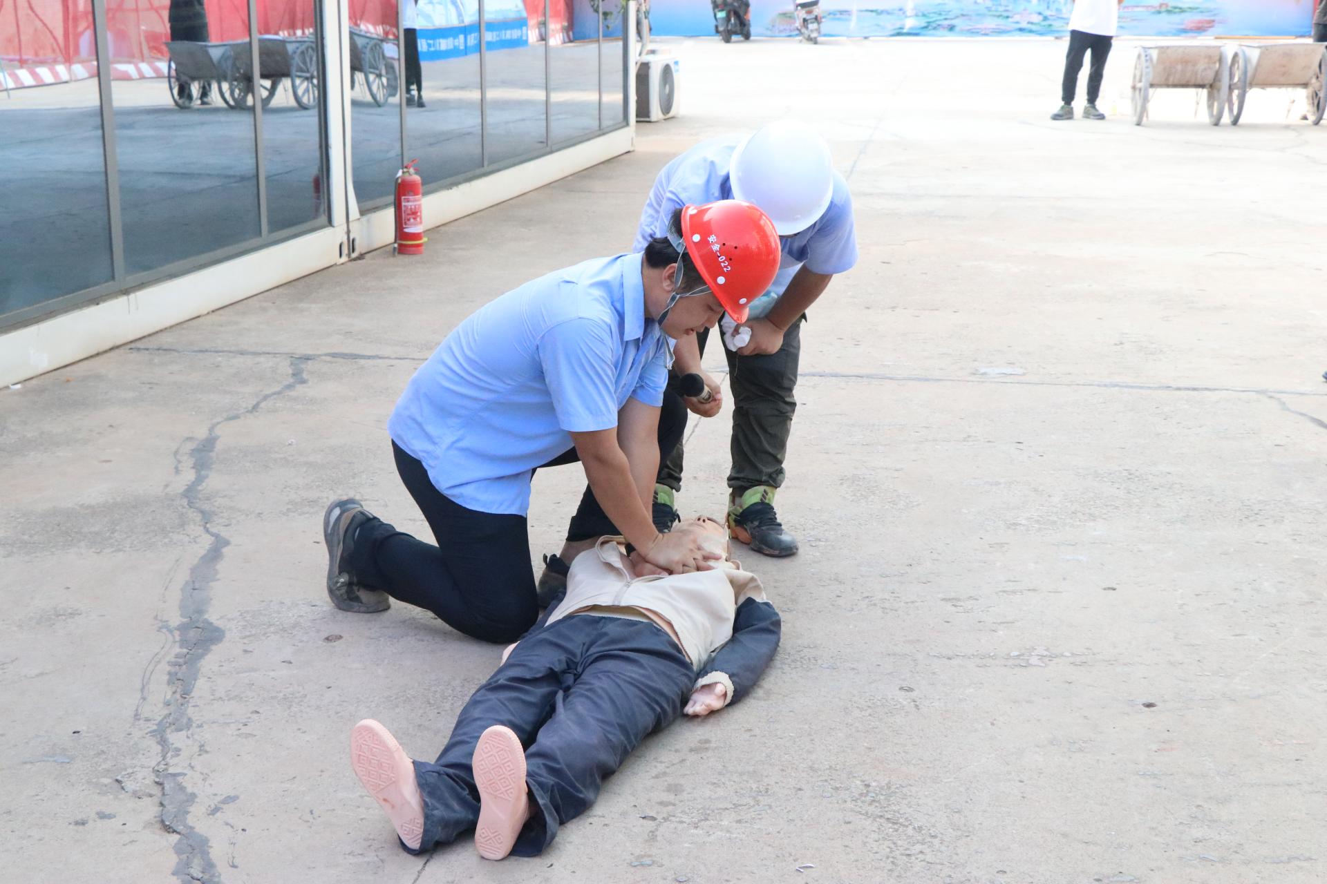 演練中,專業(yè)講解員從滅火器、消防栓使用方法及維護(hù)檢查等方面進(jìn)行了全方位講解,并以實(shí)操演示的方式,講解了人員受傷后的應(yīng)急處置方式以及心臟復(fù)蘇急救過(guò)程。講解結(jié)束后,參會(huì)人員積極參與實(shí)操環(huán)節(jié),現(xiàn)場(chǎng)氛圍十分活躍。