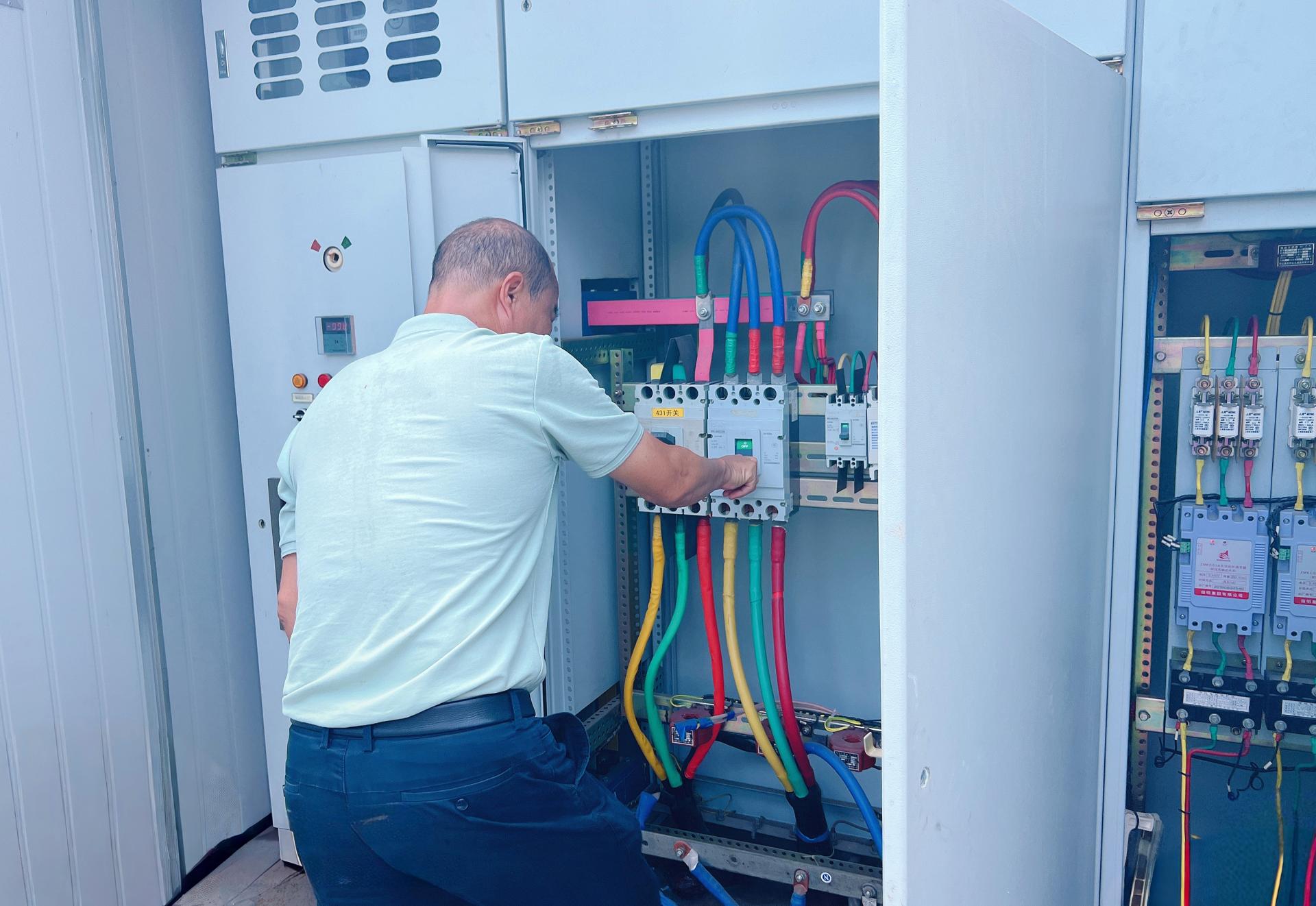 值班人員檢查南寧港受損鋪面漏水情況并采取斷電保護(hù)措施