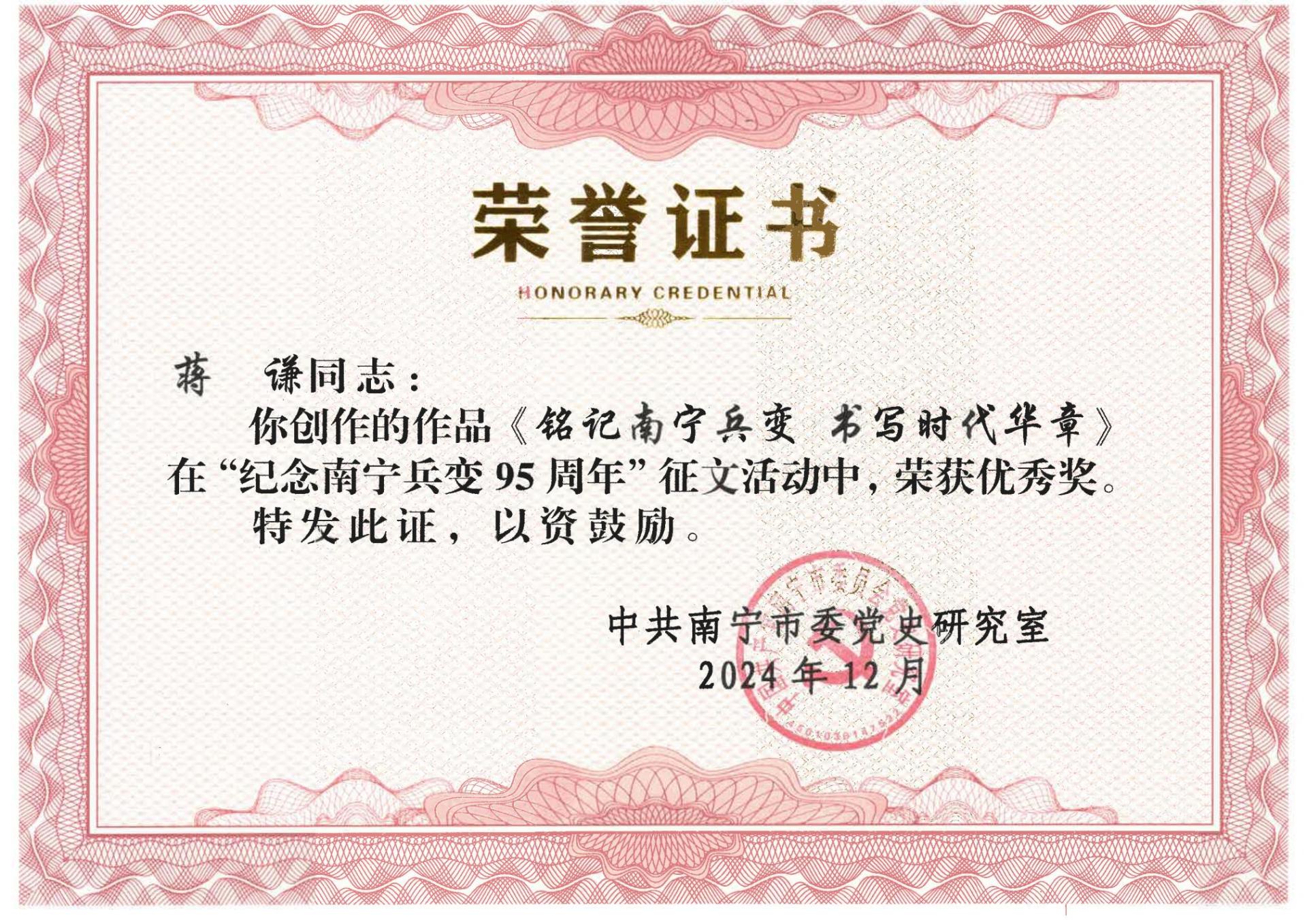 近日,在“紀念南寧兵變95周年”征文頒獎會暨作者座談會上傳出喜訊,南寧威寧集團甘海璇、蔣謙的征文作品分別榮獲三等獎和優(yōu)秀獎。