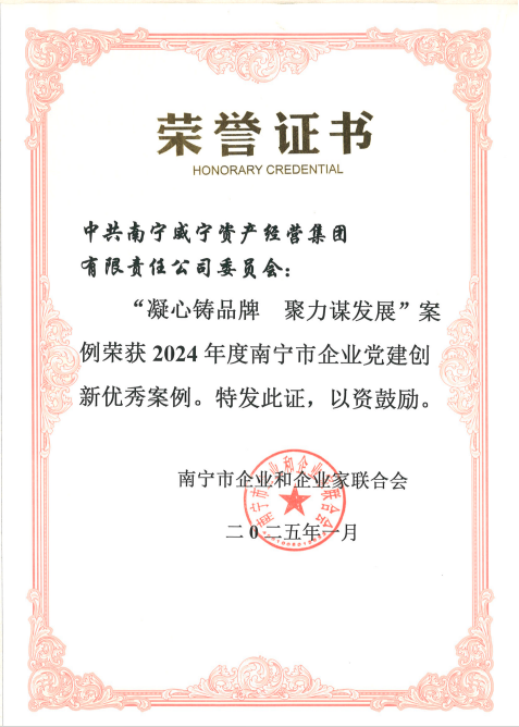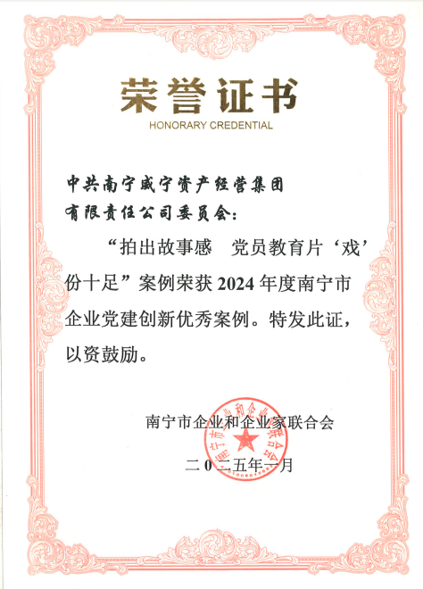 近日,威寧資產經營集團黨委“凝心鑄品牌 聚力謀發(fā)展”和“拍出故事感 黨員教育片‘戲’份十足”2個黨建品牌項目榮獲南寧市企業(yè)和企業(yè)家聯合會頒發(fā)的2024年度南寧市企業(yè)黨建創(chuàng)新優(yōu)秀案例獎項。