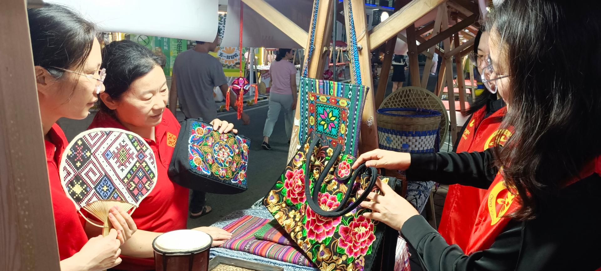 文創(chuàng)市集以展現(xiàn)廣西特色民族文化為核心,展品涵蓋非遺工藝、創(chuàng)意好物、國風藝術等品類。壯錦、繡球、銅鼓、花竹帽……各樣的民族特色物品陳列在展臺上,吸引群眾紛紛駐足了解,“威匠在線”志愿服務隊成員們細心為大家做民族特色物品講解,為群眾發(fā)放民族團結(jié)進步宣傳手冊,宣傳民族團結(jié)進步知識。