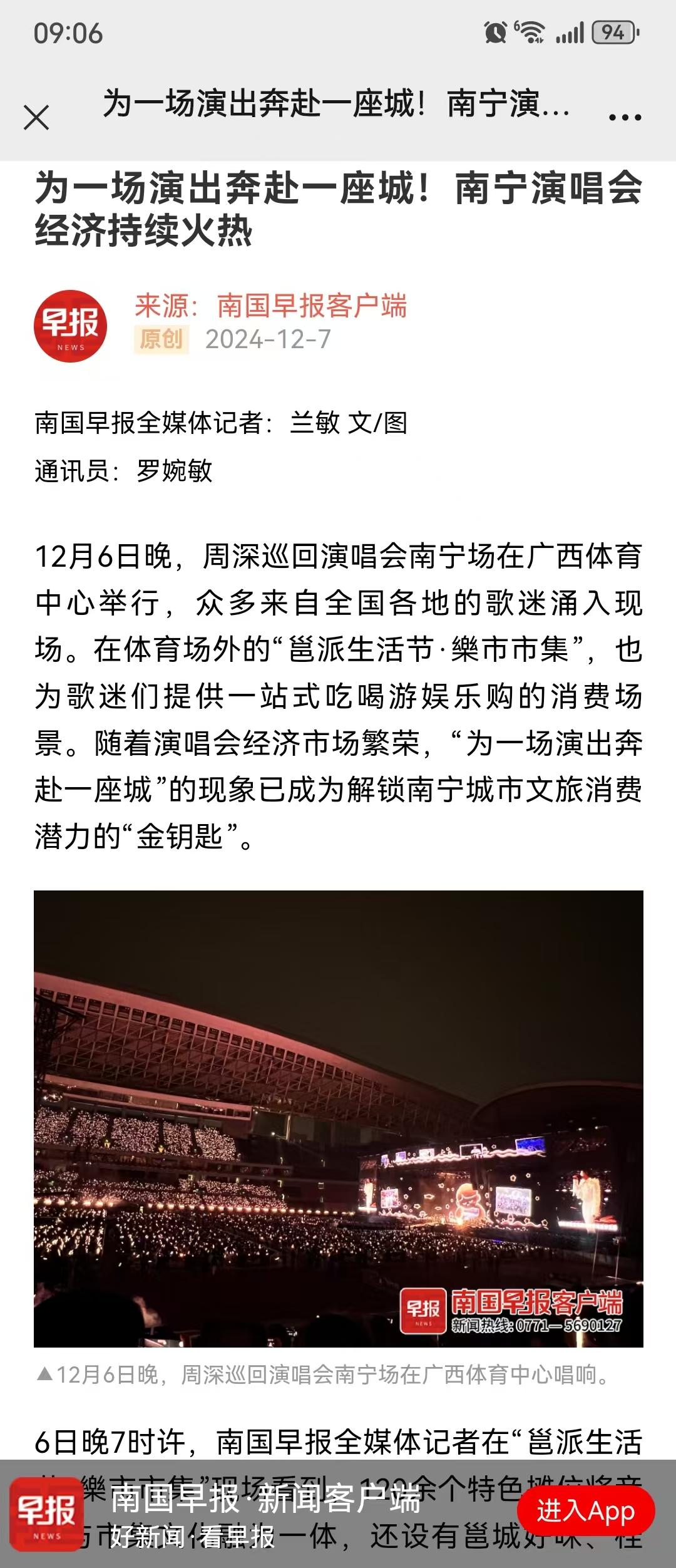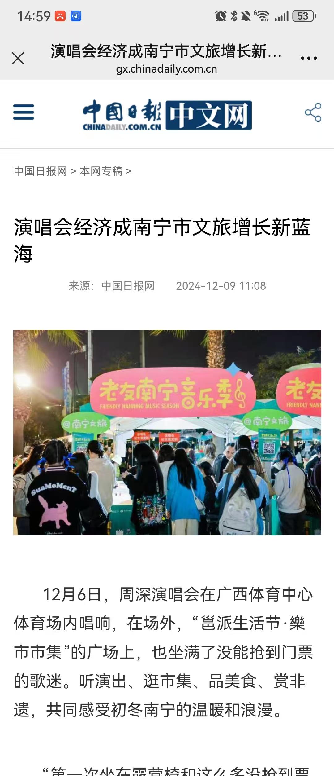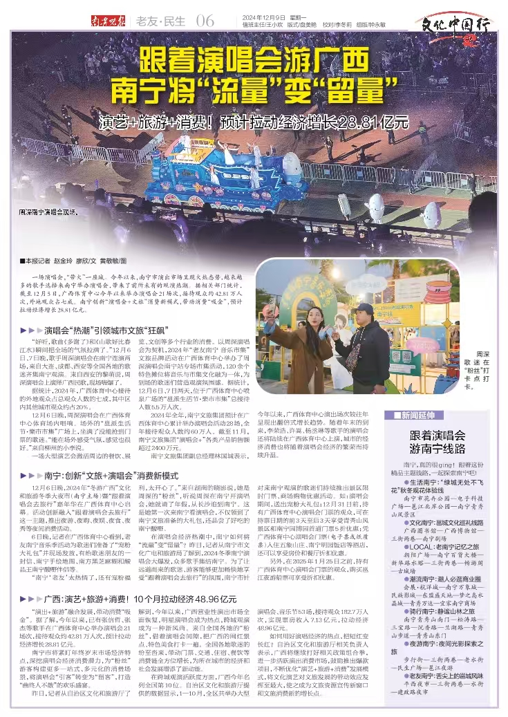 南寧創(chuàng)新“演唱會+文旅”消費新模式,2024年預(yù)計拉動經(jīng)濟增長28.81億元。在這場城市文旅狂飆賽上,南寧文旅集團激流勇進(jìn),在廣西體育中心舉辦和申報的演唱會和音樂節(jié)活動共計28場。本次南寧周深演唱會不僅是音樂愛好者的盛宴,更是南寧文旅集團展示其助力南寧演唱會經(jīng)濟、推動文旅體商融合發(fā)展的重要契機。通過邀請媒體參與此次媒體行活動,旨在深入宣傳南寧文旅集團的品牌形象,展示其在文旅產(chǎn)業(yè)發(fā)展中的新成就,進(jìn)一步提升南寧市文旅品牌形象。