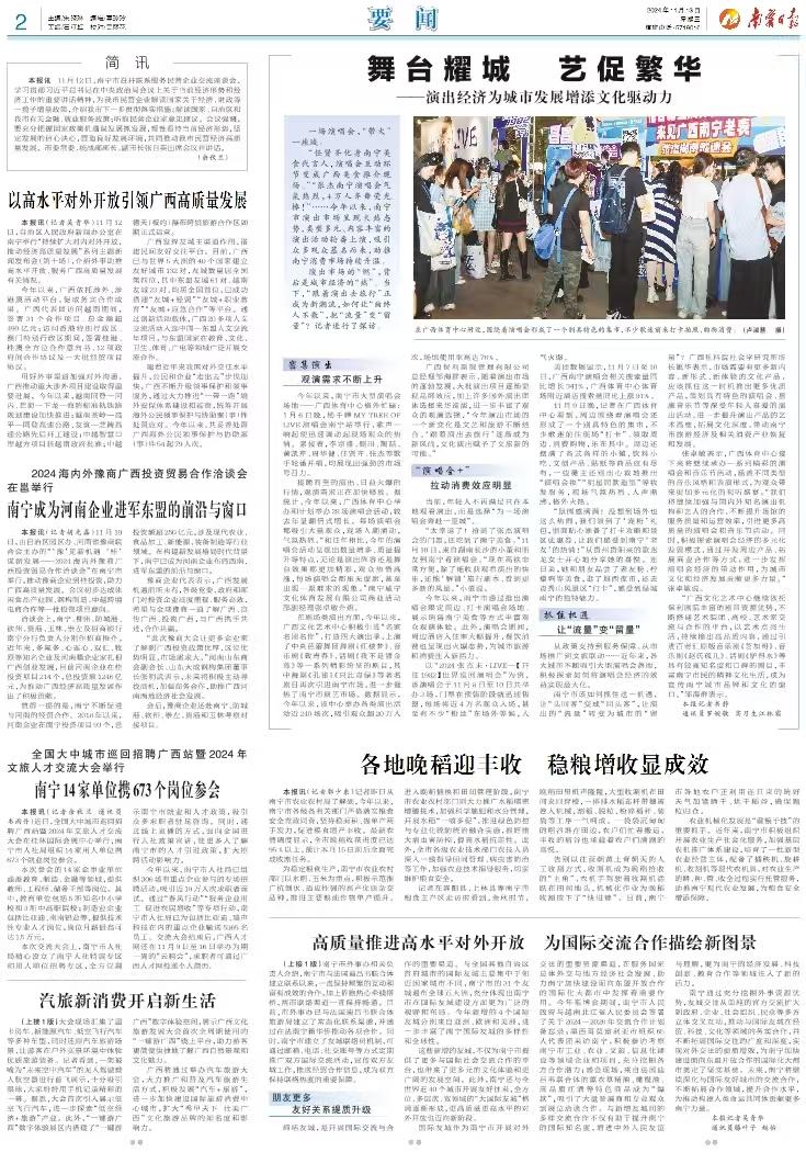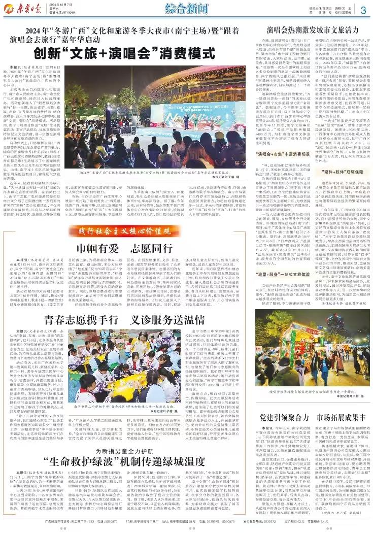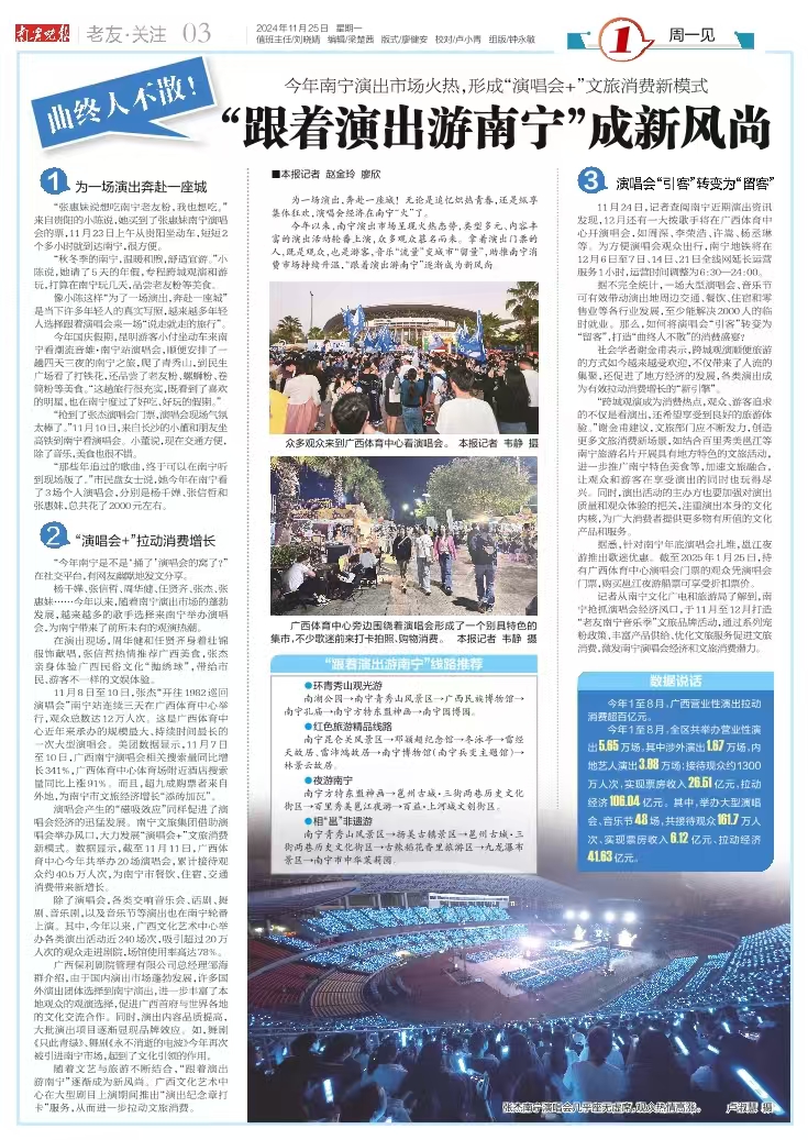 南寧文旅集團副總經(jīng)理林國城在接受媒體采訪時表示,南寧文旅集團將發(fā)揮南寧市國有文旅平臺公司的作用,推動大型、重量級的文藝演出加速加密落地,對有意向在南寧市舉辦個人演唱會的藝人加快合作步伐,力爭早日引進(jìn)。同時,將依托廣西體育中心舉辦的大型演出和賽事,持續(xù)關(guān)注和打造文旅消費新熱點,創(chuàng)造多重體驗感的文旅消費新場景。