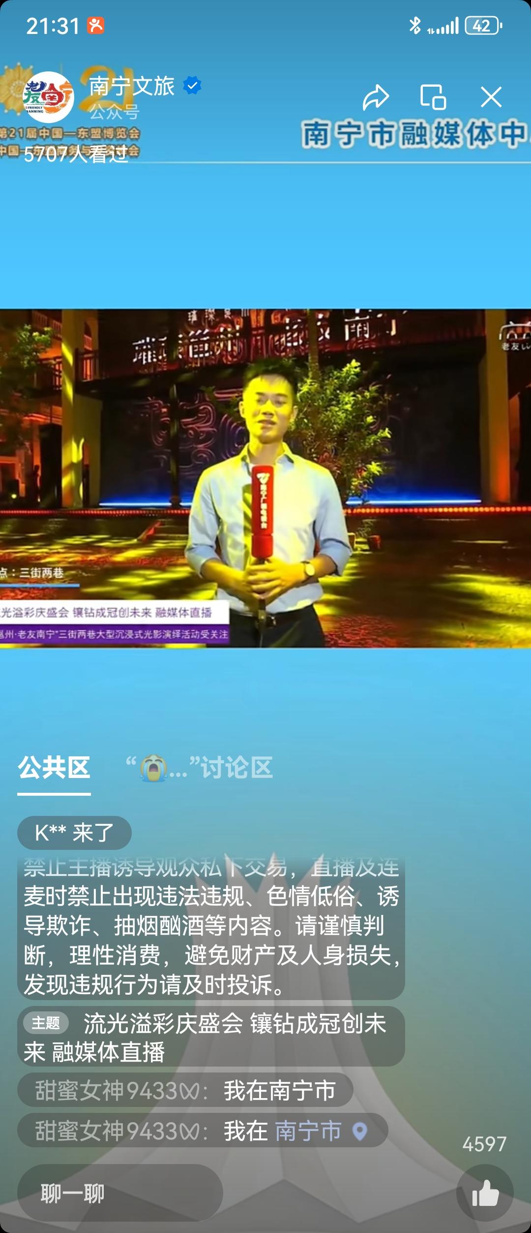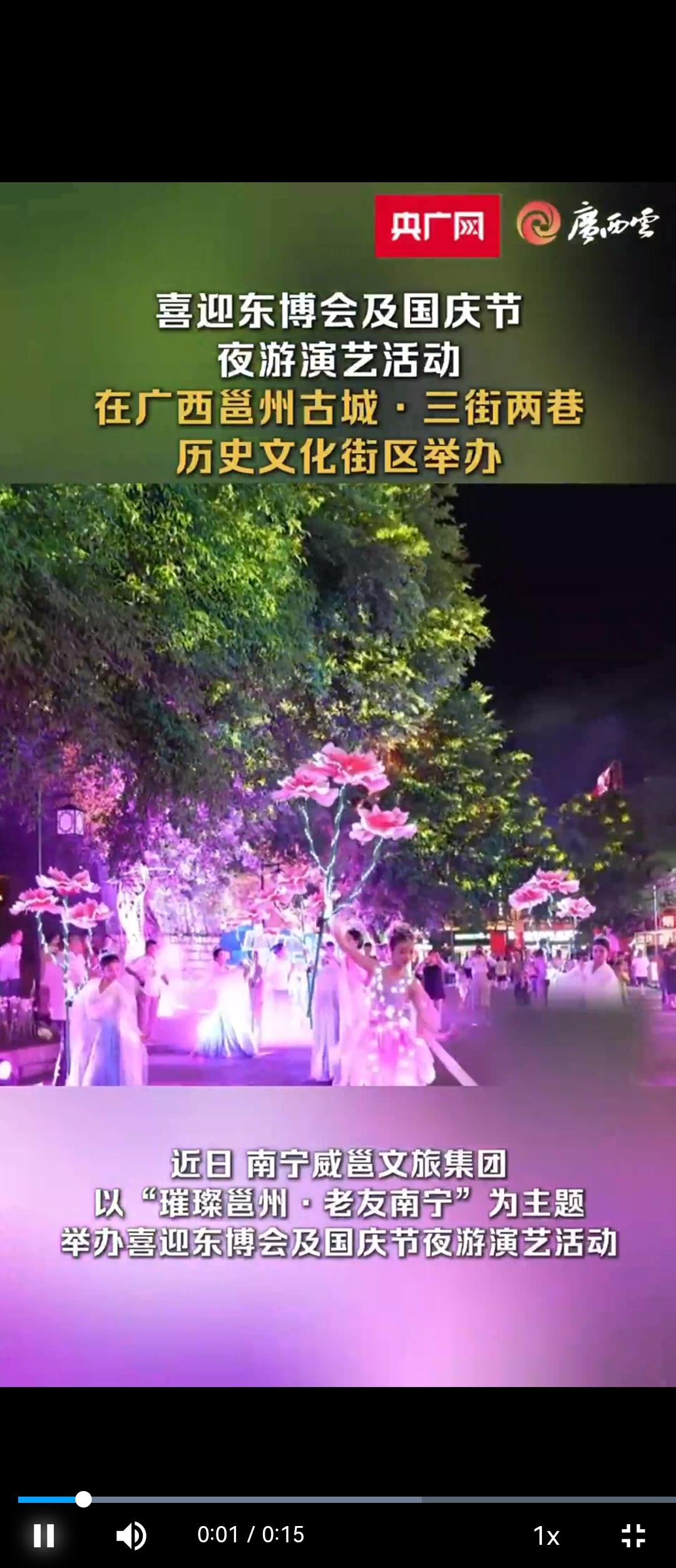 南寧市融媒新媒體平臺(tái)在活動(dòng)期間,通過(guò)“南寧文旅”等多個(gè)官方新媒體賬號(hào),對(duì)光影演繹活動(dòng)進(jìn)行了4場(chǎng)精彩的直播聯(lián)動(dòng)。這些直播不僅讓觀眾能夠身臨其境地感受光影的震撼與美麗,還通過(guò)互動(dòng)環(huán)節(jié)增強(qiáng)了觀眾的參與感與體驗(yàn)感,進(jìn)一步提升了活動(dòng)的傳播力與影響力,讓“璀璨邕州·老友南寧”成為了東博會(huì)和峰會(huì)及國(guó)慶期間最耀眼的文化名片之一。在邕州古城·三街兩巷的抖音賬號(hào),也分別在東博會(huì)和峰會(huì)期間和國(guó)慶節(jié)當(dāng)天開(kāi)通了兩場(chǎng)直播,通過(guò)兩場(chǎng)不同角度和主題的直播,既向廣大東盟和外地游客介紹了三街兩巷的參觀游覽路線,也著重展現(xiàn)了本次活動(dòng)的精華演出,吸引了眾多網(wǎng)友線上觀看后,再來(lái)線下打卡。