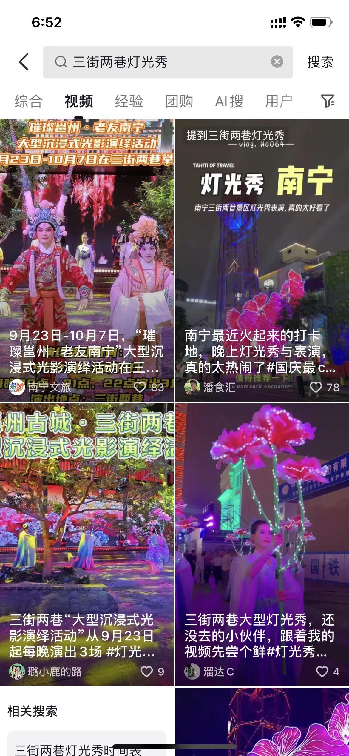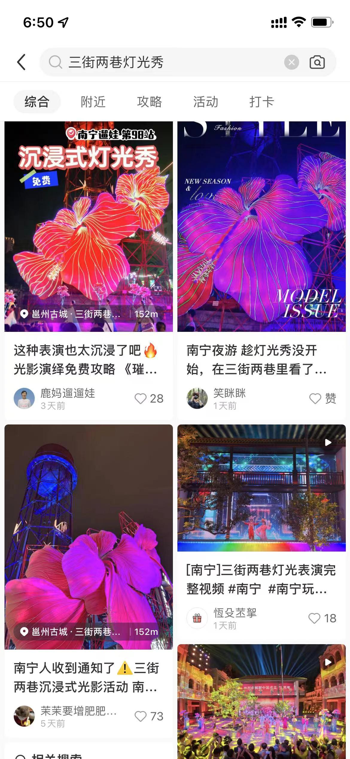 不僅如此,活動(dòng)在同城媒體和來(lái)自全國(guó)游客觀眾上傳的各類現(xiàn)場(chǎng)視頻中,成為了南寧市民及游客熱議的焦點(diǎn),“三街兩巷燈光秀”“國(guó)慶心動(dòng)打卡地”“三街兩巷美麗夜景太迷人”等熱搜詞條和新華街水塔下巨型朱槿花、朱槿花仙子翩翩起舞巡游的畫(huà)面也持續(xù)刷屏,充分展現(xiàn)了活動(dòng)在社交媒體上的高頻討論度。抖音達(dá)人“王同學(xué)”“超模CP”、自媒體賬號(hào)“識(shí)南寧”等紛紛上傳游玩打卡視頻,眾多素人博主也紛紛在抖音、小紅書(shū)等平臺(tái)上傳拍照打卡、領(lǐng)票攻略,通過(guò)一系列引人入勝的短視頻、圖文等形式分享自己的光影體驗(yàn)之旅,進(jìn)一步擴(kuò)大了活動(dòng)的影響力。截止活動(dòng)結(jié)束,社交平臺(tái)上的相關(guān)話題討論量超過(guò)百萬(wàn)次,視頻觀看量更是突破億級(jí),讓“璀璨邕州·老友南寧”成為了國(guó)慶期間網(wǎng)絡(luò)上的熱門話題。