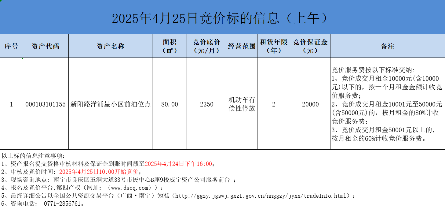 2025年4月25日競(jìng)價(jià)標(biāo)的信息(線(xiàn)上競(jìng)價(jià))