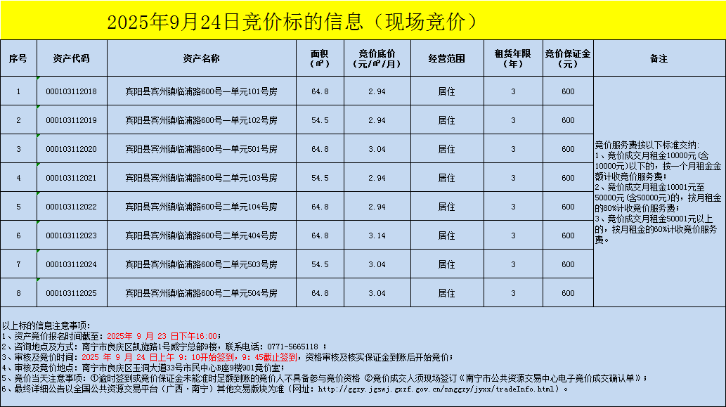 2025年9月24日競價標(biāo)的信息(現(xiàn)場競價)