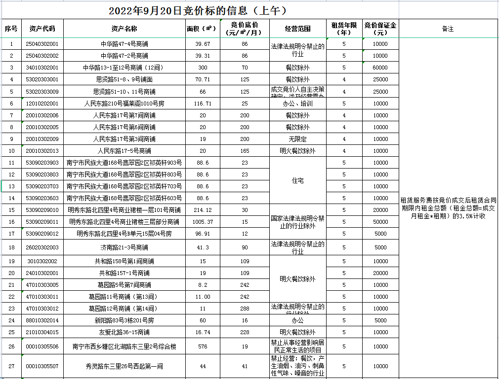 威寧資產(chǎn)公司2022年9月20日公開競價(jià)標(biāo)的信息