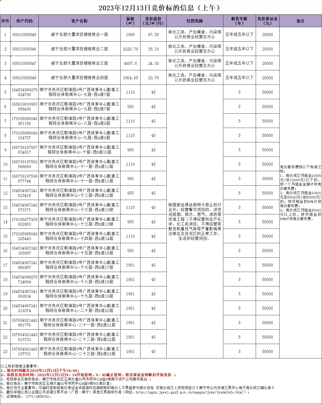 2023年12月13日競(jìng)價(jià)標(biāo)的信息