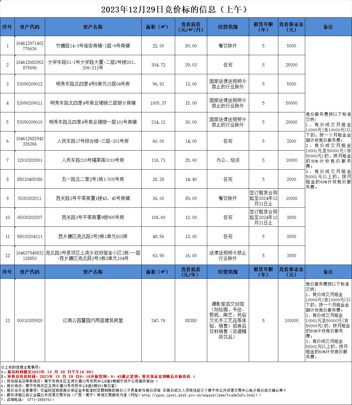 2023年12月29日競(jìng)價(jià)標(biāo)的信息