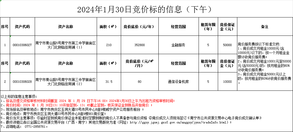 2024年1月30日競(jìng)價(jià)標(biāo)的信息