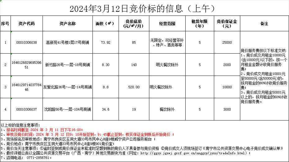 2024年3月12日競(jìng)價(jià)標(biāo)的信息(現(xiàn)場(chǎng)競(jìng)價(jià))