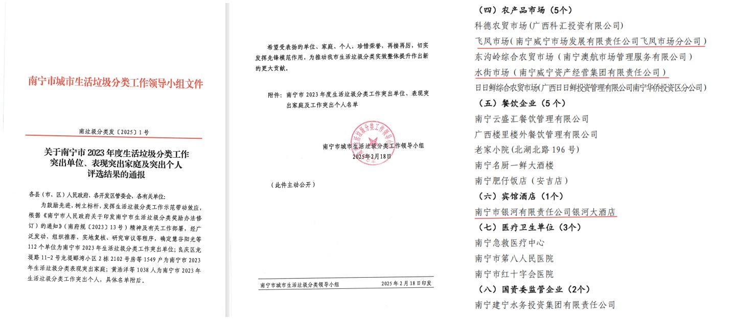 近日,南寧市生活垃圾分類辦發(fā)布通報(bào),威寧資產(chǎn)經(jīng)營集團(tuán)下屬企業(yè)威寧市場公司所屬飛鳳市場、水街市場2個(gè)農(nóng)貿(mào)市場連續(xù)兩年榮獲南寧市生活垃圾分類“工作突出單位”,威寧市場公司員工廖麗萍被評(píng)為南寧市2023年生活垃圾分類“工作突出個(gè)人”。