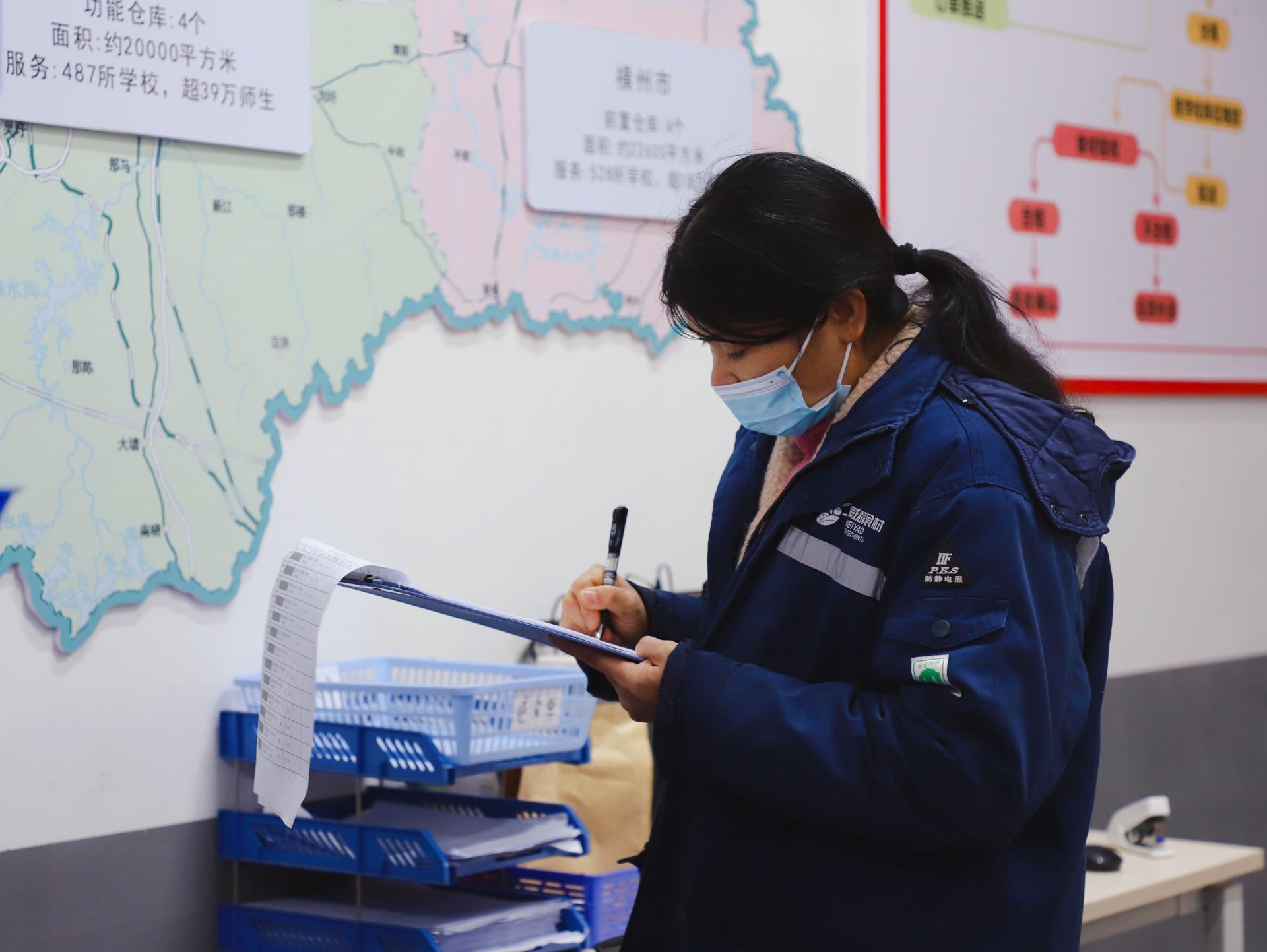 2022年底新冠疫情高峰時刻,每日都有不同的人員出現(xiàn)發(fā)燒癥狀,分揀組遇到了前所未有的困難。在人員不足的情況下,為保證學(xué)生們的餐桌上永遠(yuǎn)有熱乎的飯菜,保障學(xué)校食材的按時供應(yīng),五象配送基地員工每日都按時進(jìn)行核酸檢測,進(jìn)出基地的人員嚴(yán)格核查健康碼及核酸檢測報(bào)告,每一位能上崗的“娘子軍”自發(fā)加班加點(diǎn),迅速調(diào)整工作機(jī)制,將當(dāng)日人員不足的小組重新組隊(duì)整合,實(shí)行片區(qū)包干分揀模式,在最短的時間內(nèi)梳理了一條環(huán)環(huán)相扣、有序推進(jìn)的分揀流程,確保疫情時期沒有一所學(xué)校因?yàn)榉謷蝿?wù)延誤準(zhǔn)時配送。