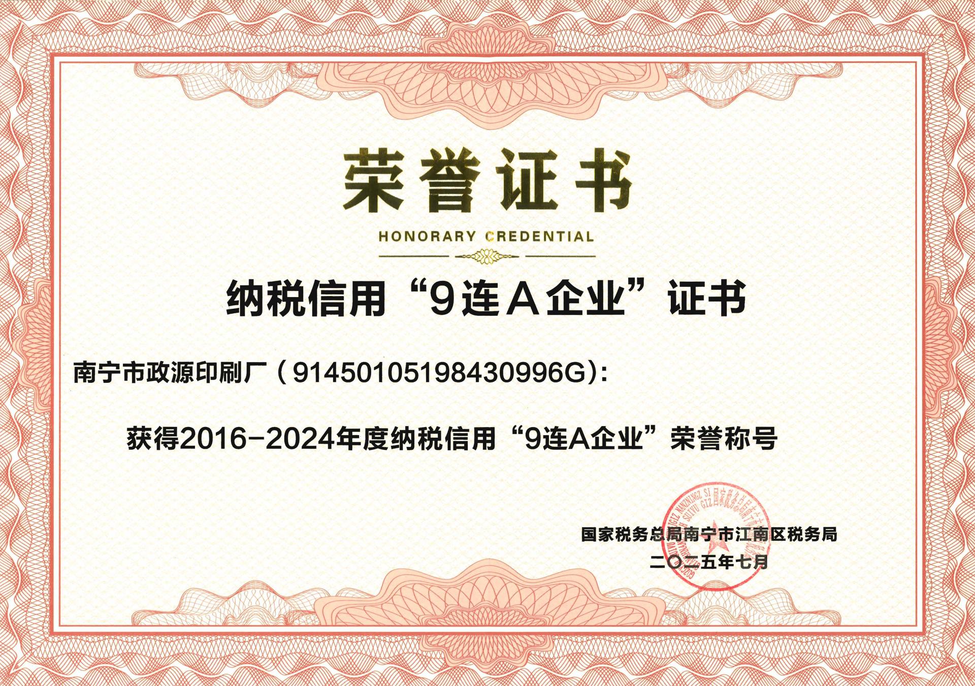 連續(xù)9年!南寧市政源印刷廠喜獲2016-2024年度納稅信用“9連A企業(yè)”榮譽(yù)稱號(hào)