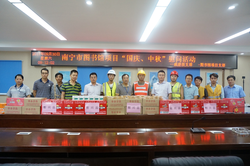 在國慶節(jié)、中秋節(jié)到來之際,為讓奮斗在項(xiàng)目一線的同志感受到黨的溫暖,2017年9月30日上午,威寧建投公司黨支部聯(lián)合南寧市圖書館項(xiàng)目黨支部到項(xiàng)目現(xiàn)場開展“雙節(jié)”慰問活動,為各隊(duì)伍一線工人送上節(jié)日的慰問。