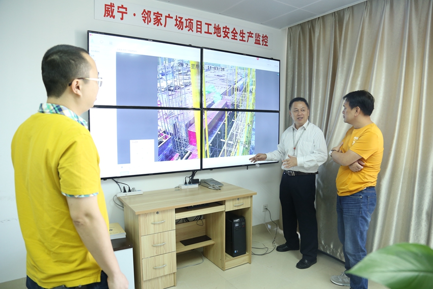 黎鎮(zhèn)宇到威寧鄰家股份公司檢查指導(dǎo)安全生產(chǎn)工作四塊顯示屏全方位多角度顯示項(xiàng)目工地情況,安全監(jiān)控崗位工作人員實(shí)時監(jiān)控,記錄并糾正不文明安全行為。2017年11月3日上午,威寧投資集團(tuán)副總經(jīng)理黎鎮(zhèn)宇帶領(lǐng)集團(tuán)公司總工辦、安全監(jiān)管部相關(guān)人員來到威寧鄰家股份公司,調(diào)研威寧?鄰家廣場項(xiàng)目工地安全生產(chǎn)監(jiān)控系統(tǒng)運(yùn)行情況。在威寧鄰家股份公司安全監(jiān)管部運(yùn)營管理部安全生產(chǎn)監(jiān)控崗,黎鎮(zhèn)宇聽取了公司董事長譚全強(qiáng)對視頻監(jiān)控系統(tǒng)