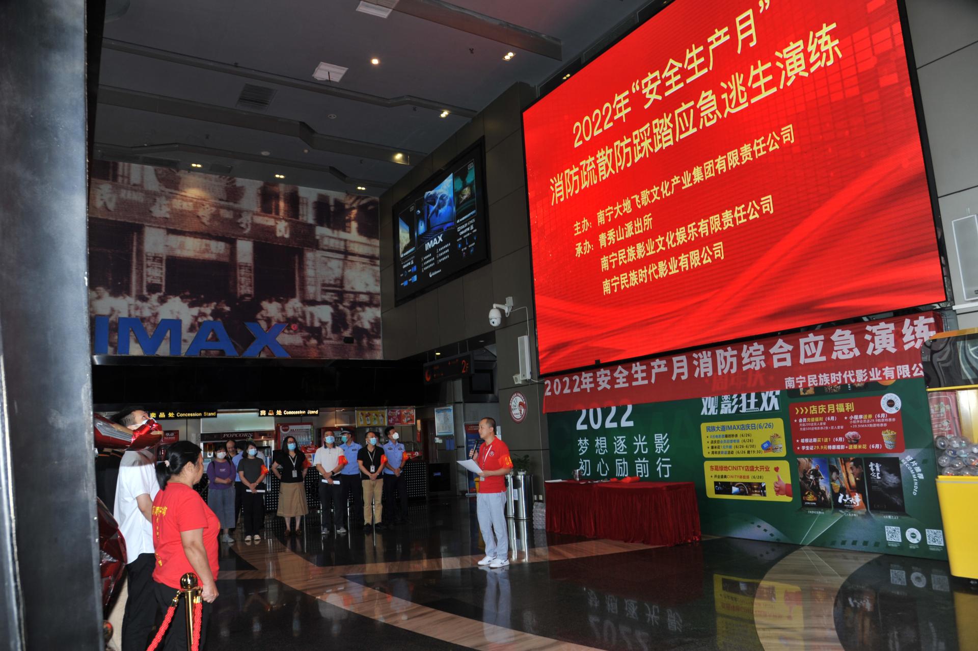 由南寧大地飛歌文化集團(tuán)有限責(zé)任公司主辦(下稱南寧大地飛歌集團(tuán)公司)、青秀山派出所、南寧民族影業(yè)文化娛樂有限責(zé)任公司(下稱民影公司)、南寧民族時代影業(yè)有限公司(下稱時代公司)聯(lián)合承辦的2022年“安全生產(chǎn)月”消防疏散防踩踏應(yīng)急逃生演練,于2022年6月22日上午在民族影城舉行。南寧大地飛歌集團(tuán)公司各部門負(fù)責(zé)人及員工、青秀山派出所部分民警、民影公司、時代公司全體人員、一分公司、影城各租賃企業(yè)(商戶)部...