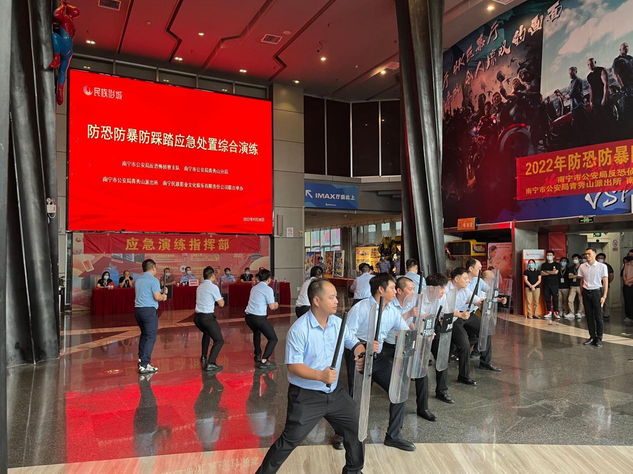 2022年9月28日上午,南寧市公安局反恐怖偵察支隊(duì)、南寧市公安局青秀山分局、南寧市公安局青秀山派出所和南寧民族影業(yè)文化娛樂有限責(zé)任公司(以下簡稱“民影公司”)在民族影城聯(lián)合舉辦防恐防暴應(yīng)急演練。應(yīng)急演練現(xiàn)場進(jìn)行了情景模擬:影城與往常一樣有序開展經(jīng)營活動(dòng),突然,2名“歹徒”沖進(jìn)影城候影大廳,揮舞著匕首、鐵棍。頓時(shí),候影大廳內(nèi)“觀眾”四處逃散、慌亂躲避,場面非?;靵y。在這危急關(guān)頭,...