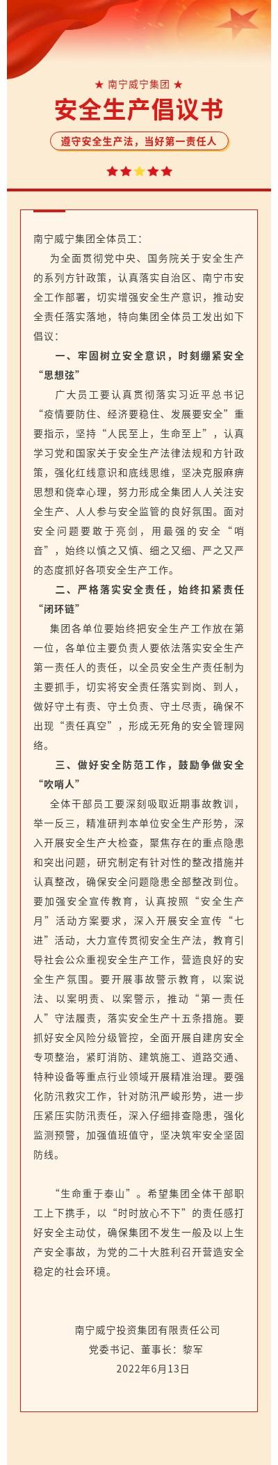 南寧威寧集團(tuán)安全生產(chǎn)倡議書