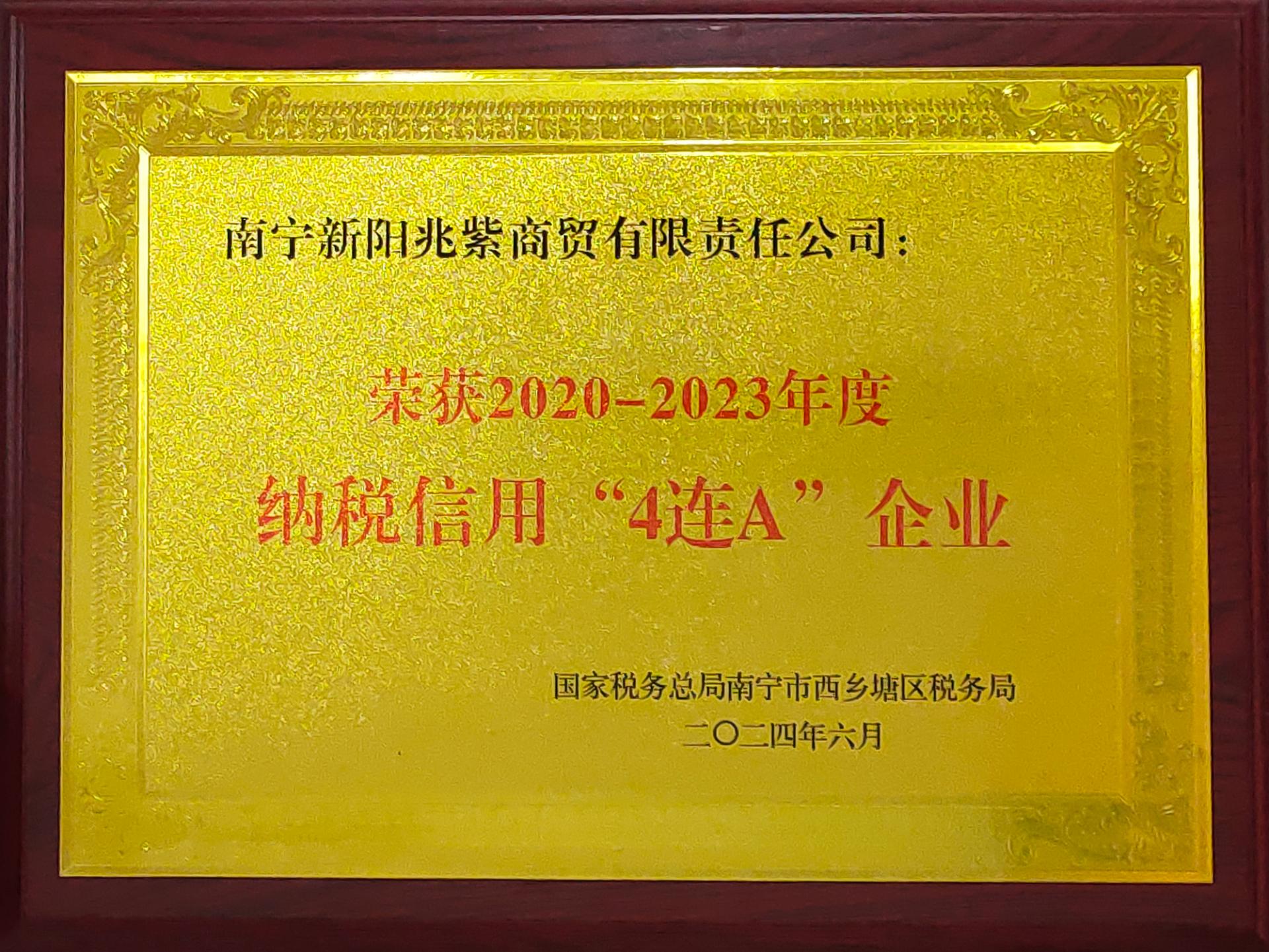 新陽兆紫商貿(mào)公司榮獲2020-2023年度納稅信用“4連A企業(yè)”榮譽(yù)稱號(hào)