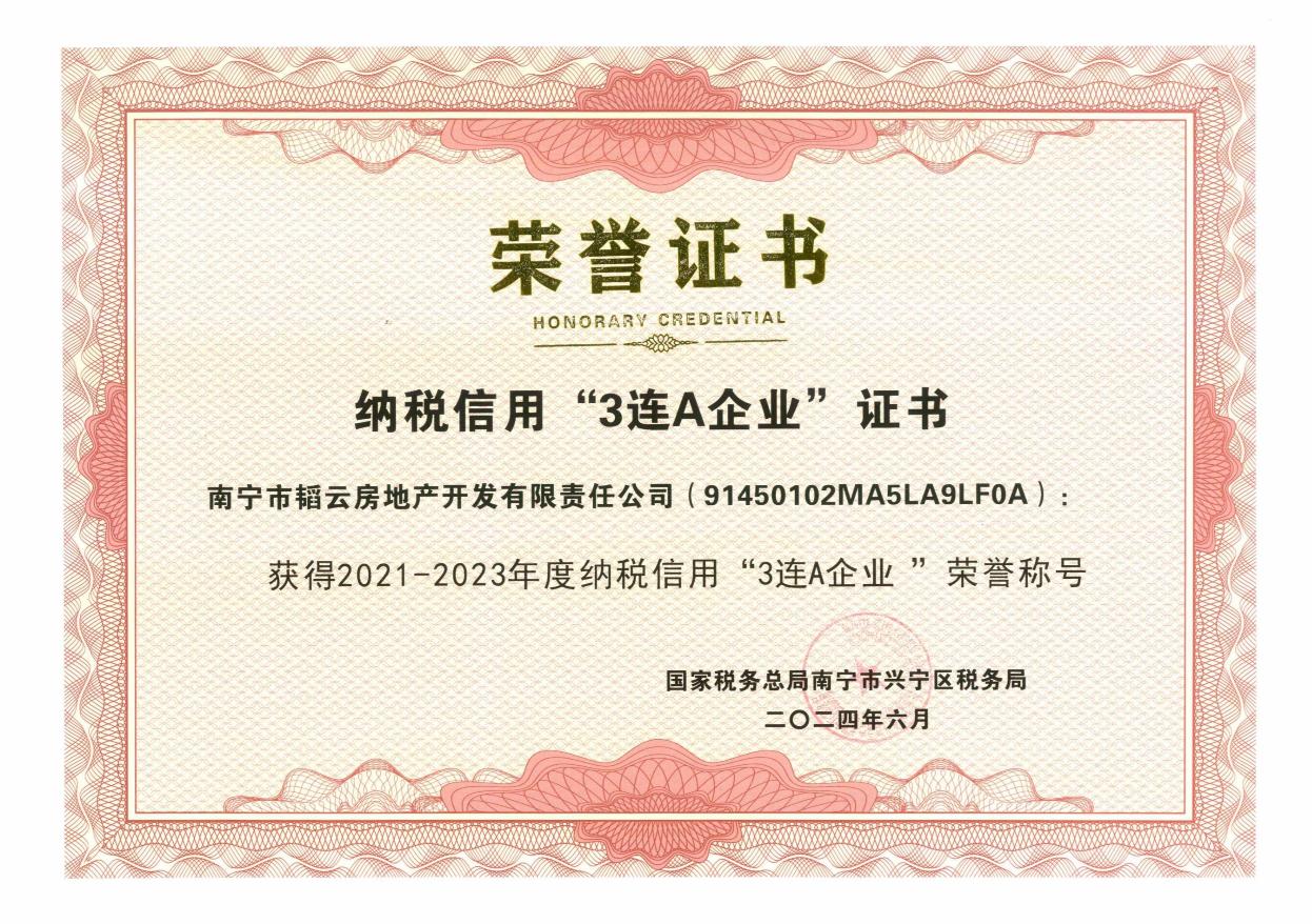 近日,威寧房地產(chǎn)開發(fā)集團(tuán)監(jiān)管單位韜云公司榮獲國家稅務(wù)總局南寧市興寧區(qū)稅務(wù)局授予2021-2023年度納稅信用“3連A企業(yè)”榮譽(yù)稱號(hào)。A級(jí)是國家納稅信用評(píng)級(jí)中的最高級(jí)別,“3連A企業(yè)”更是代表了稅務(wù)機(jī)關(guān)對韜云公司過去3年良好納稅信用的最優(yōu)評(píng)價(jià)和肯定。長期以來,公司高度重視稅務(wù)管理,在日常工作中認(rèn)真貫徹落實(shí)國家稅收法律法規(guī)和相關(guān)制度,采用精細(xì)稅務(wù)管理方式,夯實(shí)基礎(chǔ)稅務(wù)數(shù)據(jù)沉淀工作,依法依規(guī)、按時(shí)足額申報(bào)...