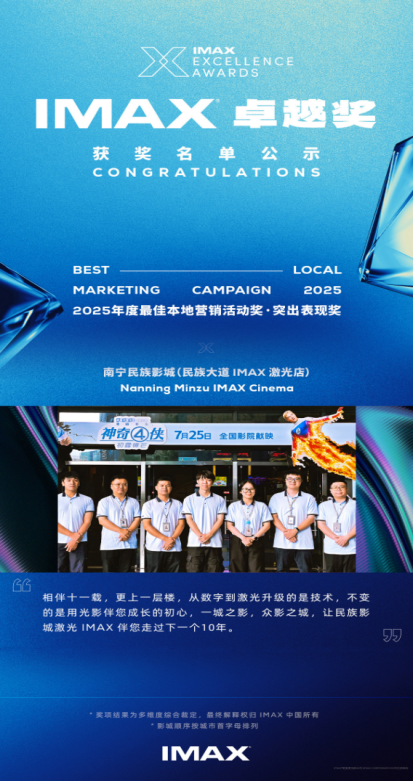 ?南寧民族影城(民族大道IMAX激光店)榮獲全球首屆IMAX卓越獎2024-2025年度,IMAX公司首次面向全球影院合作伙伴推出“卓越獎”評選活動,這一計劃旨在樹立全球IMAX影城在商業(yè)表現(xiàn)層面的“黃金標準”,表彰為IMAX全球網(wǎng)絡(luò)帶來突出價值的影城團隊。在此次激烈的評選中,南寧民族影城(民族大道IMAX激光店)憑借著在市場活動中展現(xiàn)出的卓越策劃與高效執(zhí)行能力,在全球眾多的IMAX影院中脫穎而出,榮獲“最佳本地營銷活動獎?突出表...
