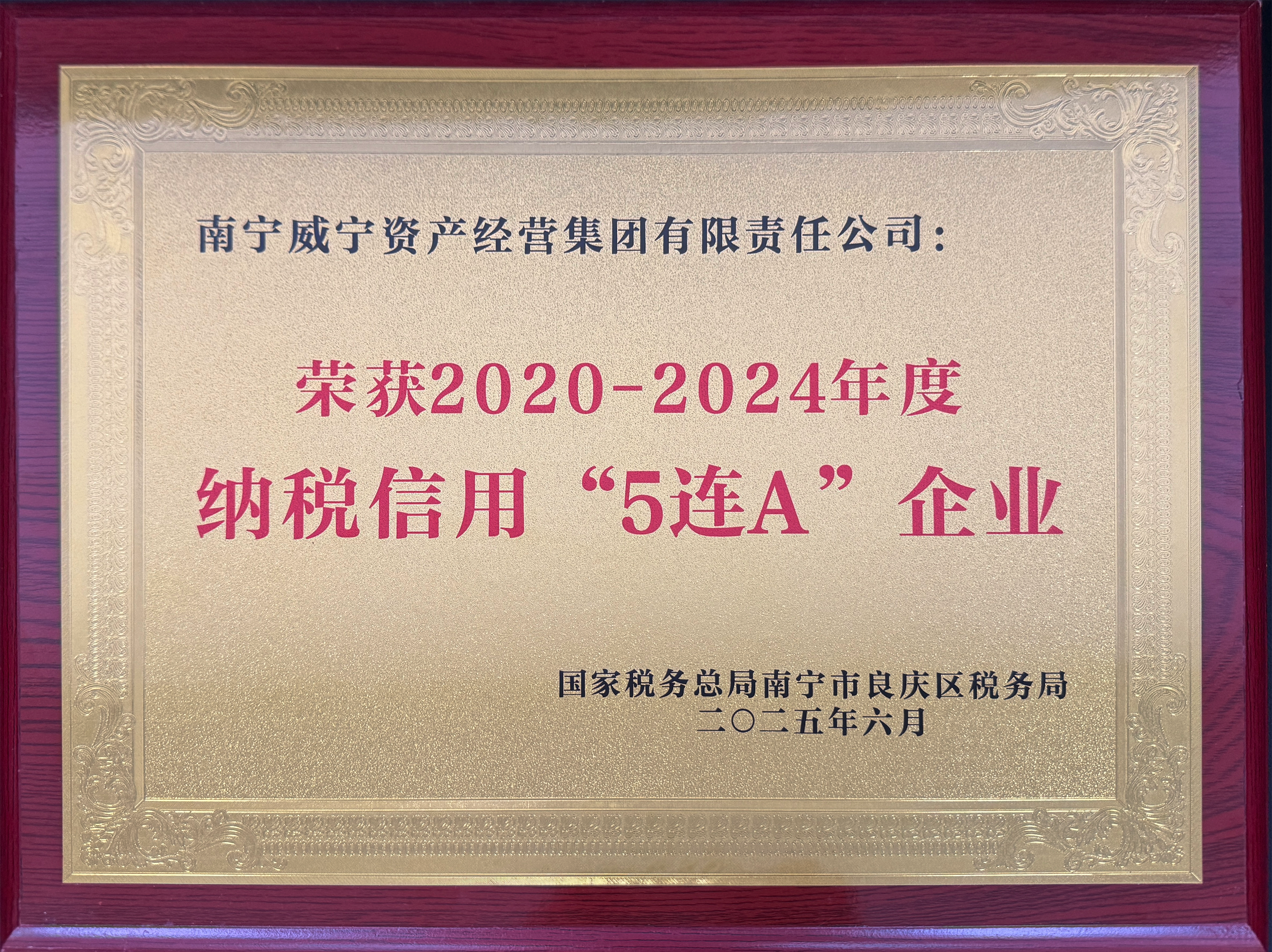 榮譽牌匾近日,南寧威寧集團所屬企業(yè)威寧資產(chǎn)經(jīng)營集團榮獲國家稅務(wù)總局南寧市良慶區(qū)稅務(wù)局授予的“2020-2024年度納稅信用‘5連A’企業(yè)”榮譽。此次獲評,已是威寧資產(chǎn)經(jīng)營集團連續(xù)5年榮獲納稅信用等級A級納稅人稱號。據(jù)悉,“納稅信用A級”是稅務(wù)機關(guān)對企業(yè)在納稅信用管理方面的高度認可與贊譽。長期以來,威寧資產(chǎn)經(jīng)營集團高度重視稅收管理工作,積極履行納稅義務(wù),嚴格貫徹落實國家法律法規(guī)和稅收相關(guān)制度規(guī)定,堅持依法經(jīng)營、...