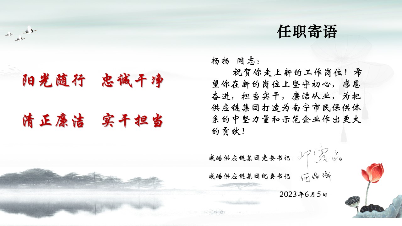 “XX同志:祝賀你走上新的工作崗位!希望你在新的崗位上堅守初心,感恩奮進,擔當實干,廉潔從業(yè),為把供應鏈集團打造為南寧市民保供體系的中堅力量和示范企業(yè)作出更大的貢獻!”2023年6月5日下午,威皓供應鏈集團首發(fā)力第一時間為整合重組調(diào)整的24名中層管理人員開具任職提醒“第一配方”,通過電子卡形式送上祝福、寄語期望、以廉潤心,警醒新任職的中層管理人員清醒任職、廉潔履職,為履新人員扣好“第一??圩印?。“良言一...