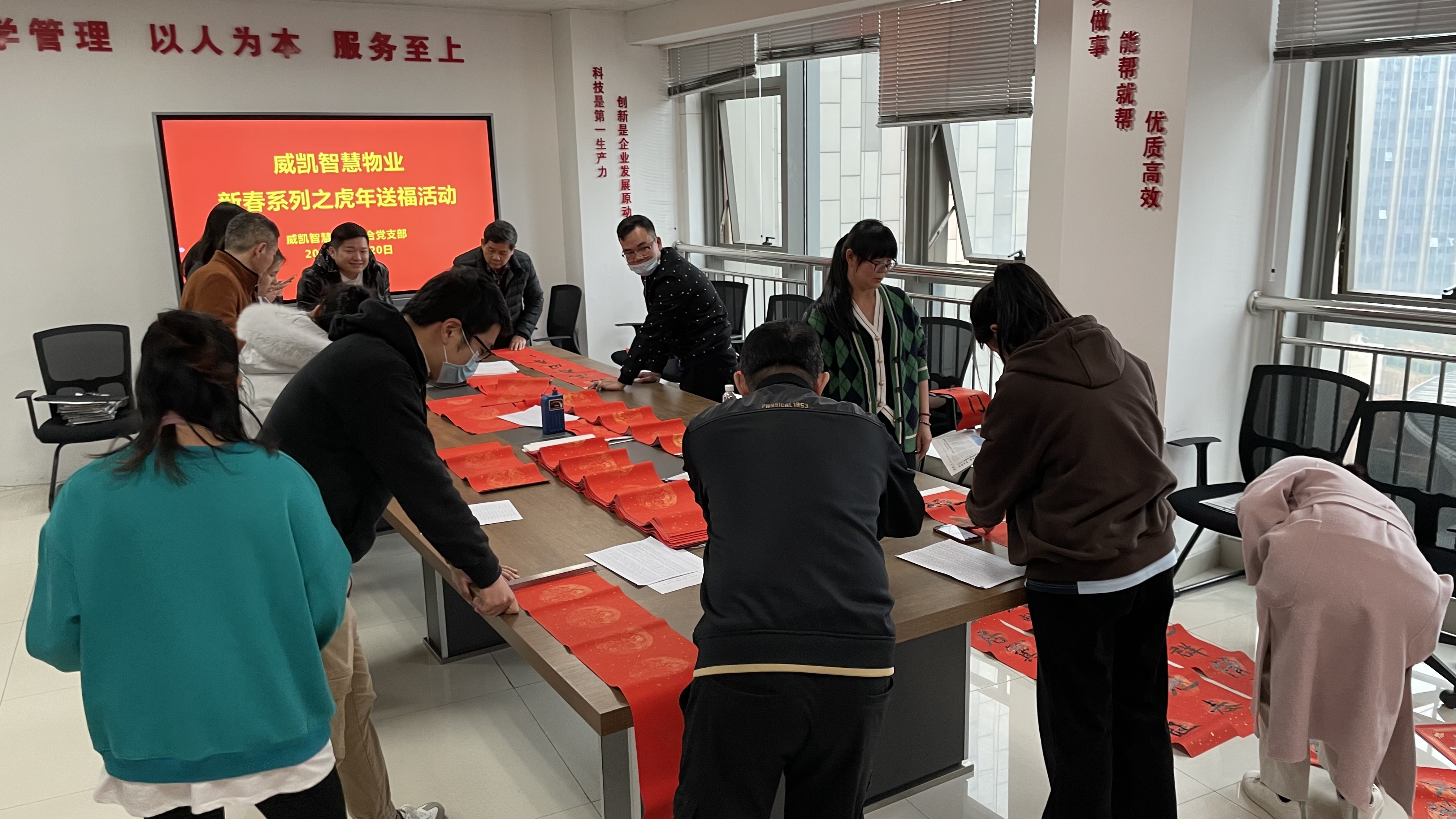 活動現(xiàn)場轉(zhuǎn)眼,距離農(nóng)歷新年的腳步越來越近了。為了弘揚中華傳統(tǒng)文化,增添公司新年氛圍,2022年1月20日威凱智慧物業(yè)公司聯(lián)合黨支部組織了“寅虎迎春 墨香送?!睂懘郝?lián)送福主題黨日活動?;顒咏M織了公司黨員職工、家屬現(xiàn)場書寫春聯(lián),為即將來臨的春節(jié)增添了濃濃的喜慶氛圍。活動現(xiàn)場,書法“達人”們手持文房四寶,揮毫潑墨,熱情洋溢地寫下一副副春聯(lián)和一張張“福”字,一筆一畫遒勁有力,一字一句增添吉祥瑞氣,其他黨員